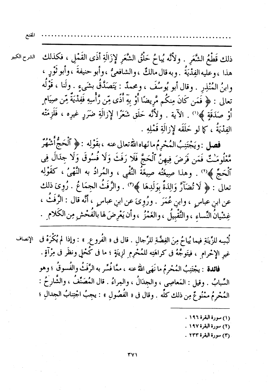 فائدة: يجْتَنِبُ المُحْرِمُ ما نَهَى اللهُ عنه، ممَّا فُسِّر به الرَّفَثُ والفُسوقُ؛ وهو السِّبابُ. وقيل: المَعاصِى، والجِدَالُ، والمِراءُ. قال المُصَنِّفُ، والشَّارِحُ: المُحْرِمُ ممْنُوعٌ مِن ذلك كلِّه. وقال فى «الفُصُولِ»: يجِبُ اجْتِنابُ الجِدالِ؛