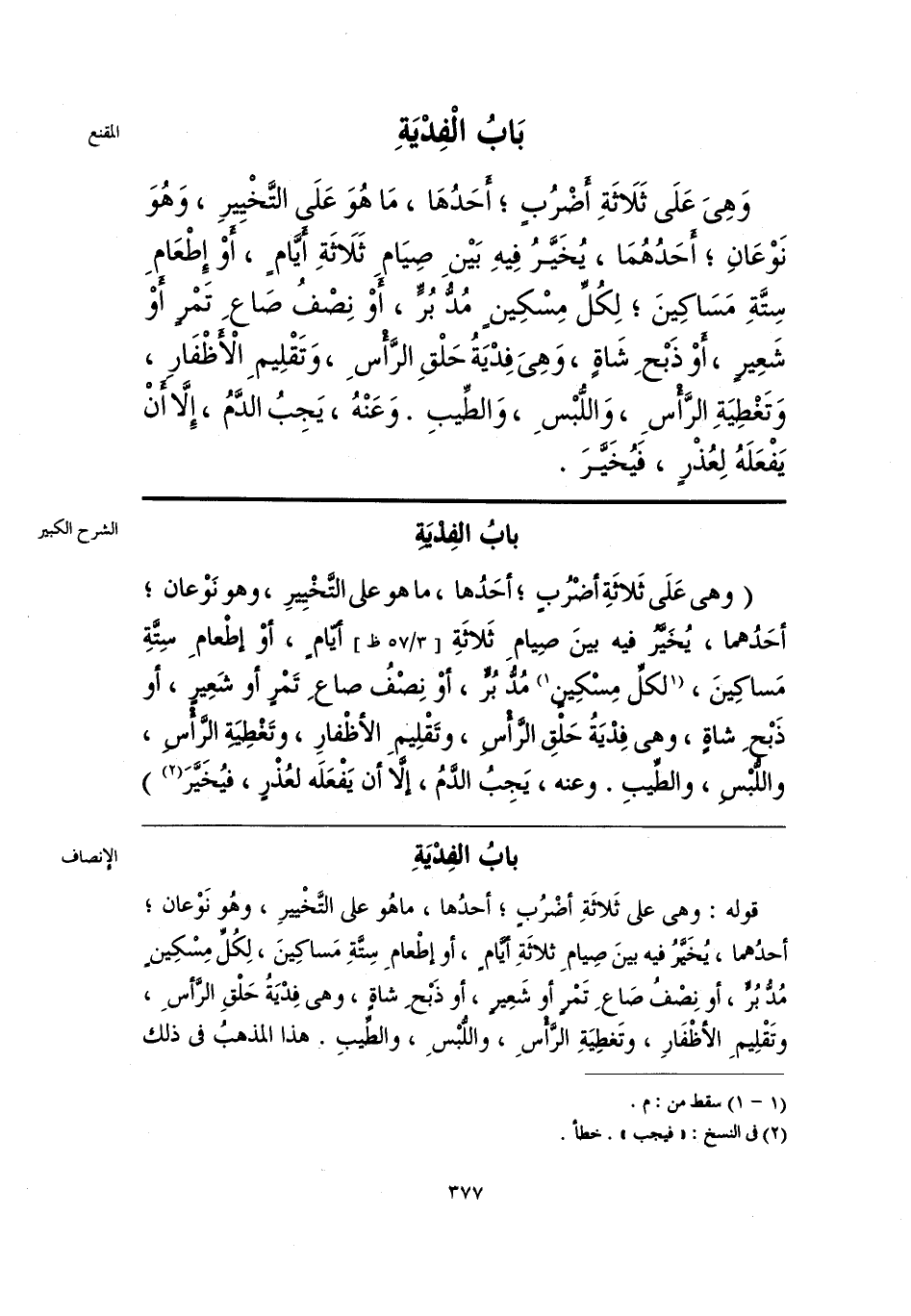 قوله: وهى على ثَلاَثةِ أضْرُبٍ؛ أحدُها، ما هُو على التَّخْييرِ، وهُو نَوْعان؛ أحدُهما، يُخَيَّرُ فيه بينَ صِيامِ ثلاثَةِ أيَّام، أو إطْعامِ سِتَّةِ مَساكِينَ، لِكُلِّ مِسْكِينٍ مُدُّ بُرٍّ، أو نِصْفُ صَاعِ تَمْرٍ أو شَعِيرٍ، أو ذَبْحِ شاةٍ، وهى فِدْيَةُ حَلْقِ الرَّأسِ، وتَقْلِيمِ الأظْفَارِ، وتَغطِيَةِ الرَّأْسِ، واللُّبْسِ، والطِّيبِ. هذا المذهبُ فى ذلك