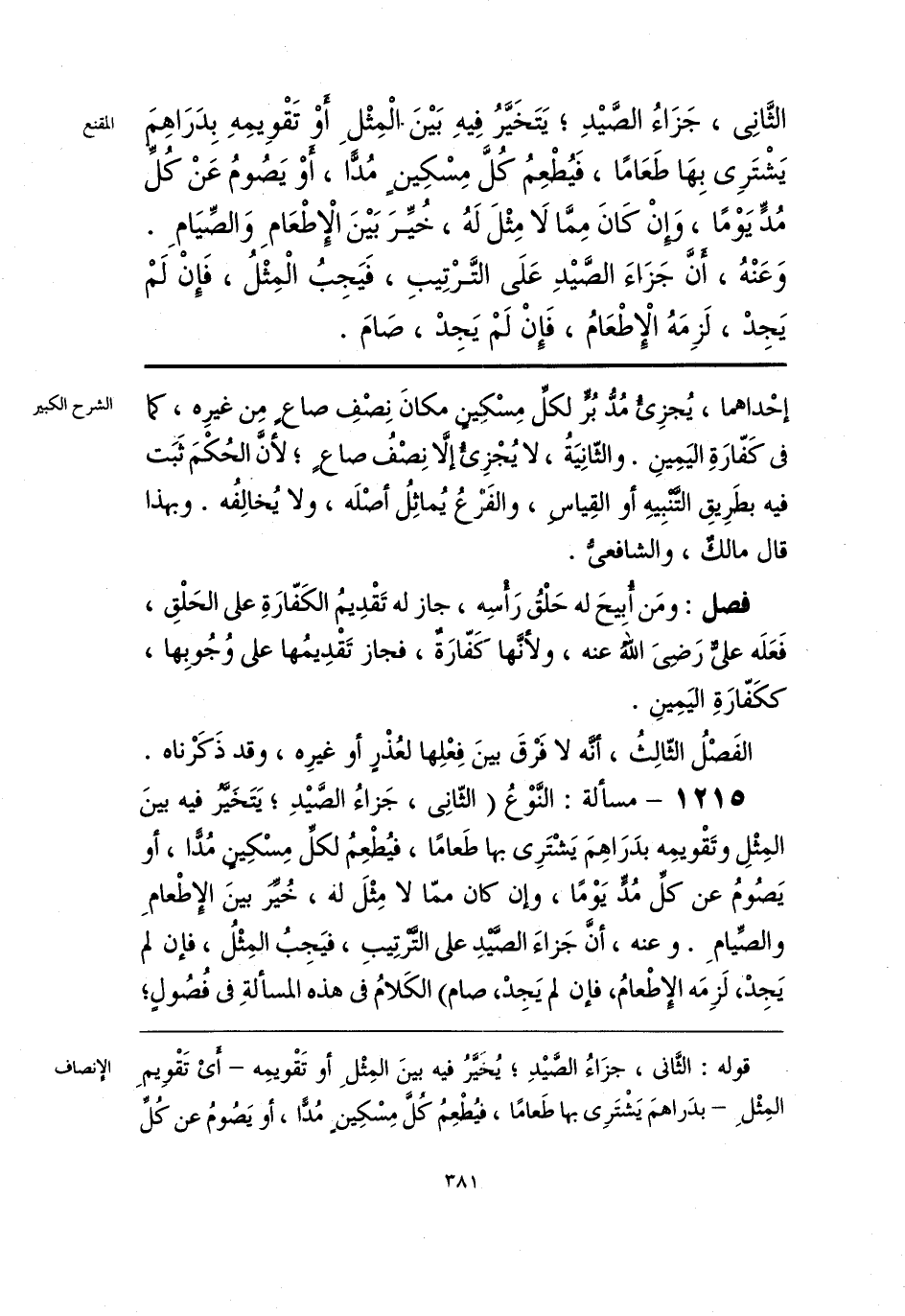 الثَّانِى، جَزَاءُ الصَّيْدِ؛ يَتَخَيَّرُ فِيهِ بَيْنَ الْمِثْلِ أوْ تَقْوِيمِهِ بِدَرَاهِمَ يَشْتَرِى بِهَا طَعَامًا، فَيُطْعِمُ كُلَّ مِسْكِين مُدًّا، أَوْ يَصُومُ عَنْ كُلِّ مُدٍّ يَوْمًا، وَإنْ كَانَ مِمَّا لَا مِثْلَ لَهُ، خُيِّرَ بَيْنَ الإطْعَامِ وَالصِّيَامِ. وَعَنْهُ، أنَّ جَزَاءَ الصَّيْدِ عَلَى التَّرْتِيبِ، فَيَجِبُ الْمِثْلُ، فَإِن لَمْ يَجِدْ، لَزِمَهُ الإطْعَامُ، فَإِنْ لَمْ يَجِدْ، صَامَ.