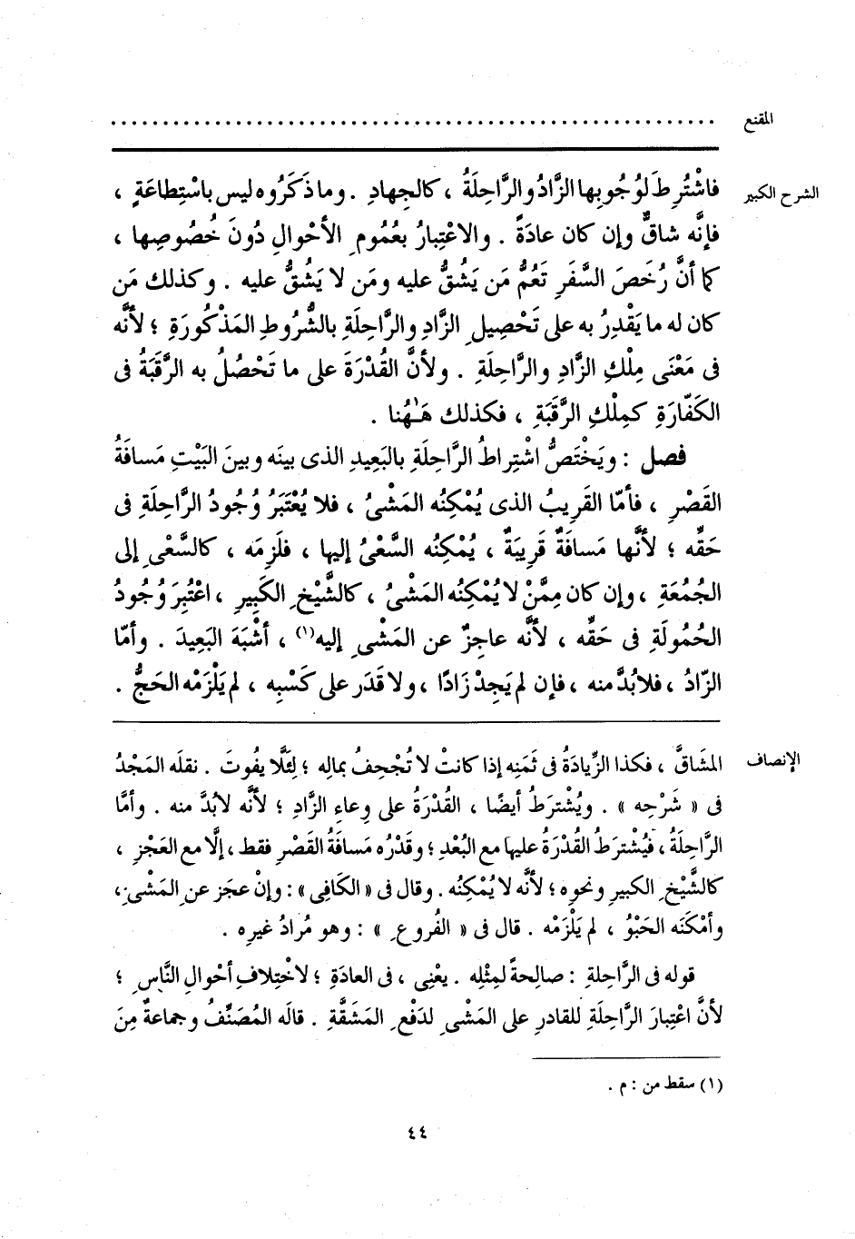 قوله في الرَّاحِلةِ: صالِحةً لمِثْلِه. يعْنِى، في العادَةِ؛ لاخْتِلافِ أحْوالِ النَّاس؛ لأنَّ اعْتِبارَ الرَّاحِلَةِ للقادرِ على المَشْىِ لدَفْعِ المَشَقَّةِ. قالَه المُصَنِّفُ وجاعةٌ مِنَ