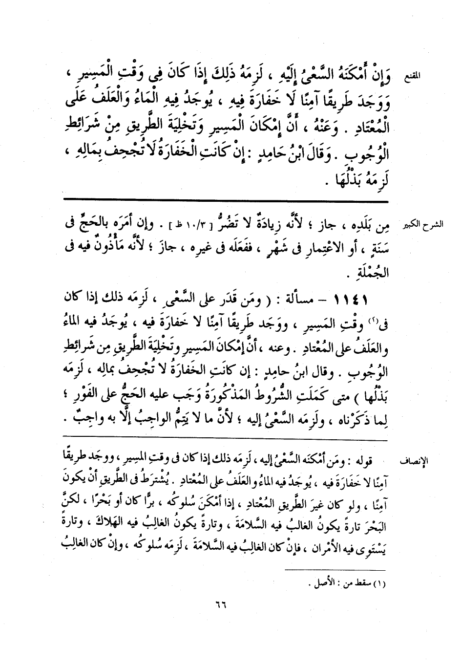 قوله: ومَن أمْكنَه السَّعْىُ إليه، لَزِمَه ذلك إذا كان فى وقتِ المسِيرِ، ووجَد طرِيقًا آمِنًا لا خَفَارَةَ فيه، يُوجَدُ فيه الماءُ والعَلَفُ على المُعْتادِ. يُشْترَطُ فى الطَّريقِ أنْ يكونَ آمِنًا، ولو كان غيرَ الطَّريقِ المُعْتادِ، إذا أمْكَنَ سُلوكُه، برًّا كان أو بَحْرًا، لكنَّ البَحْرَ تارةً يكونُ الغالبُ فيه السَّلامَةَ، وتارةً يكونُ الغالِبُ فيه الهَلاكَ، وتارةً يَسْتَوِى فيه الأمْران، فإنْ كان الغالِبُ فيه السَّلامَةَ، لَزِمَه سُلوكُه، وإنْ كان الغالِبُ