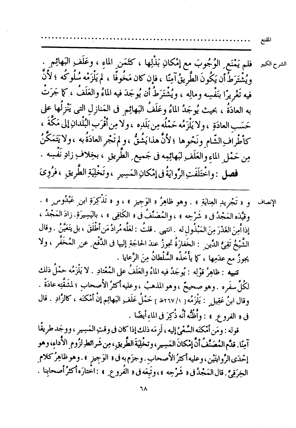 تنبيه: ظاهِرُ قوْلِه: يُوجَدُ فيه الماءُ والعَلَفُ على المُعْتادِ. لا يَلْزَمُه حمْلُ ذلك لكُلِّ سفَرِه. وهو صحيحٌ، وهو المذهبُ، وعليه أكثرُ الأصحابِ؛ لمشَقَّتِه عادَةً. وقال ابنُ عَقِيلٍ: يَلْزَمُه حَمْلُ عَلَفِ البَهائِم إنْ أمْكنَه، كالزَّادِ. قال فى «الفروعِ»: وأظُنُّه أنَّه ذُكِرَ فى الماءِ أيضًا.