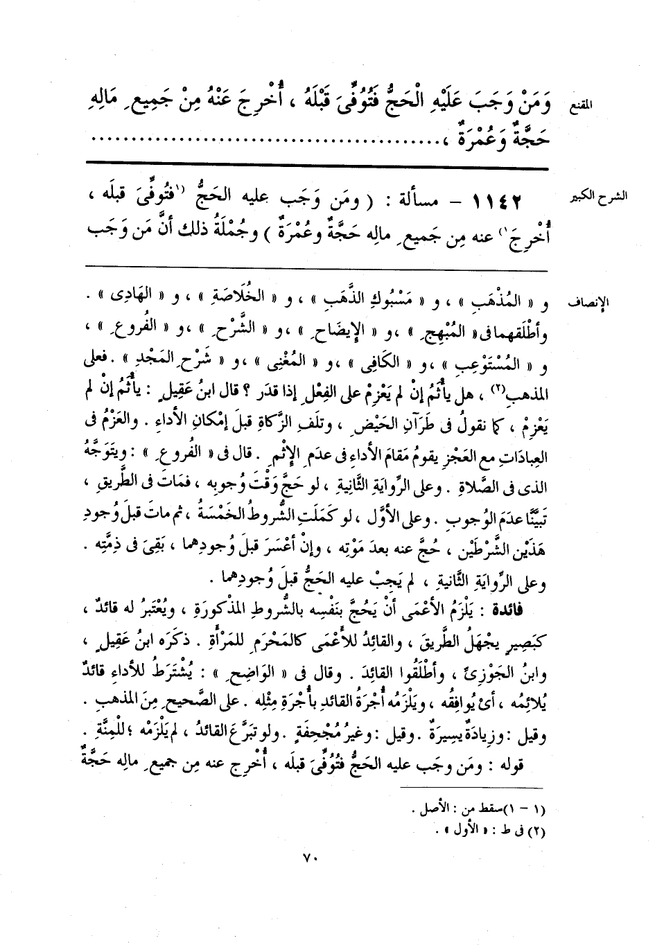 و «المُذْهَبِ»، و «مَسْبُوكِ الذَّهَبِ»، و «الخُلَاصَةِ»، و «الهَادِى». وأطْلَقهما فى «المُبْهِجِ»، و «الإِيضَاحِ»، و «الشَّرْحِ»، و «الفُروعِ»، و «المُسْتَوْعِبِ»، و «الكَافِى»، و «المُغْنِى»، و «شَرْحِ المَجْدِ». فعلى المذهبِ (¬1)، هل يأْثَمُ إنْ لم يَعْزِمْ على الفِعْلِ إذا قدَر؟ قال ابنُ عَقِيلٍ: يأْثَمُ إنْ لم يَعْزِمْ، كما نقولُ فى طَرَآنِ الحَيْضِ، وتلَفِ الزَّكاةِ قبلَ إمْكانِ الأداءِ. والعَزْمُ فى العِبادَاتِ مع العَجْزِ يقومُ مَقامَ الأداءِ فى عدَمِ الإِثْمِ. قال فى «الفُروعِ»: ويتَوَجَّهُ الذى فى الصَّلاةِ. وعلى الرِّوايَةِ الثَّانِيةِ، لو حَجَّ وَقْتَ وُجوبِه، فمَات فى الطَّريقِ، تَبيَّنَّا عدَمَ الوُجوبِ. وعلى الأوَّل، لو كَمَلَتِ الشُّروطُ الخَمْسَةُ، ثم ماتَ قبلَ وُجودِ هَذَيْن الشَّرْطَيْن، حُجَّ عنه بعدَ مَوْتِه، وإنْ أعْسَرَ قبلَ وُجودِهما، بَقِىَ فى ذِمَّتِه. وعلى الرِّوايَةِ الثَّانيةِ، لم يَجِبْ عليه الحَجُّ قبلَ وُجودِهما.