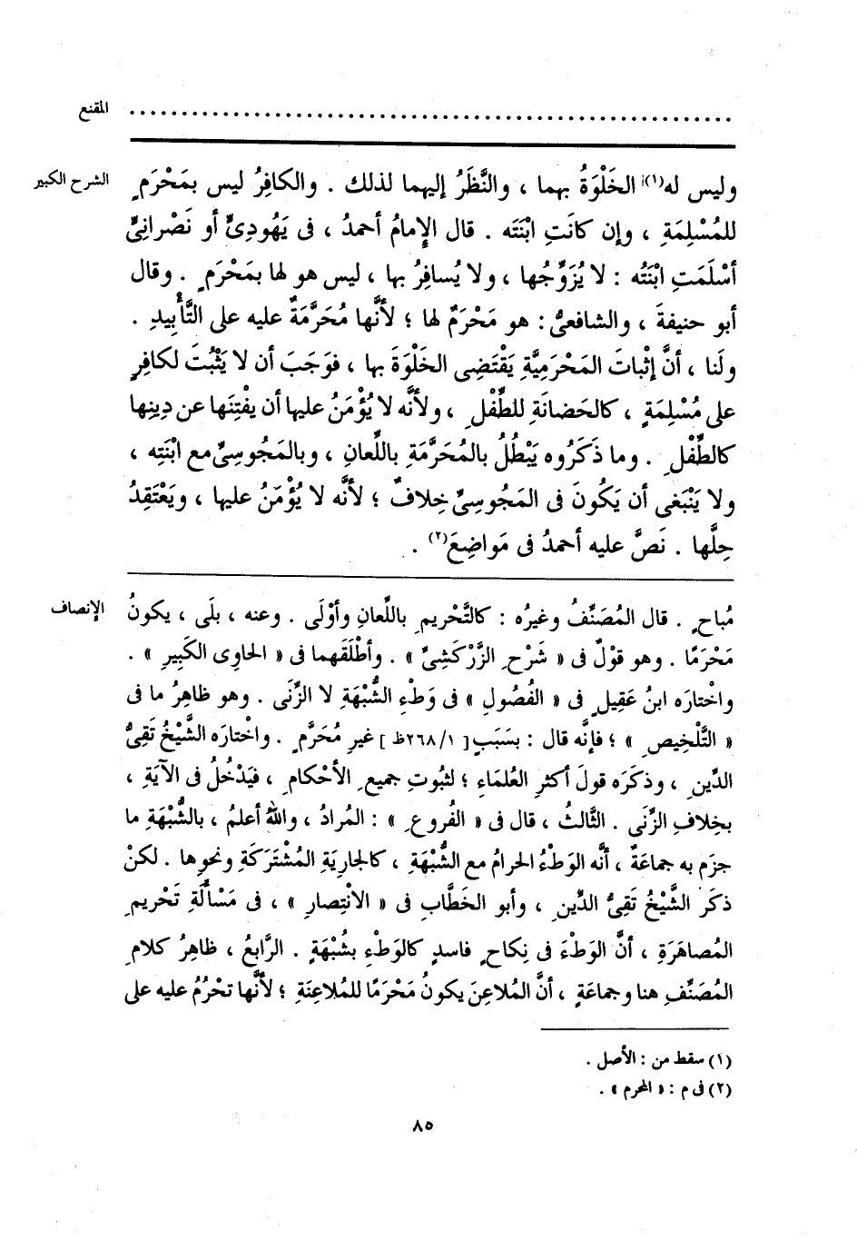 مُباحٍ. قال المُصَنِّفُ وغيرُه: كالتَّحْريمِ باللِّعانِ وأوْلَى. وعنه، بلَى، يكونُ مَحْرَمًا. وهو قوْلٌ فى «شَرْحِ الزَّرْكَشِىَّ». وأطْلَقَهما فى «الحاوِى الكَبِيرِ». واخْتارَه ابنُ عَقِيلٍ فى «الفُصُولِ» فى وَطْءِ الشُّبْهَةِ لا الزِّنَى. وهو ظاهِرُ ما فى «التَّلْخِيصِ»؛ فإنَّه قال: بسَبَبٍ غيرِ مُحَرَّمٍ. واخْتارَه الشَّيْخُ تَقِىُّ الدِّينِ، وذكَرَه قولَ أكثرِ العُلمَاءِ؛ لثبُوتِ جميعِ الأحْكامِ، فيَدْخُلُ فى الآيَةِ، بخِلافِ الزِّنَى. الثَّالثُ، قال فى «الفُروعِ»: المُرادُ، واللهُ أعلمُ، بالشُّبْهَةِ ما جزَم به جماعَةٌ، أنَّه الوَطْءُ الحرامُ مع الشُّبْهَةِ، كالجارِيَةِ المُشْتَرَكَةِ ونحوِها. لكنْ ذكَر الشَّيْخُ تَقِى الدِّينِ، وأبو الخَطَّابِ فى «الانْتِصارِ»، فى مَسْأَلَةِ تَحْريمِ المُصاهَرَةِ، أنَّ الوَطْءَ فى نِكاحٍ فاسدٍ كالوَطْءِ بشُبْهَةٍ. الرَّابعُ، ظاهِرُ كلامِ المُصَنِّفِ هنا وجماعَةٍ، أن المُلاعِنَ يكونُ مَحْرَمًا للمُلاعِنَةِ؛ لأنَّها تحْرُمُ عليه على
