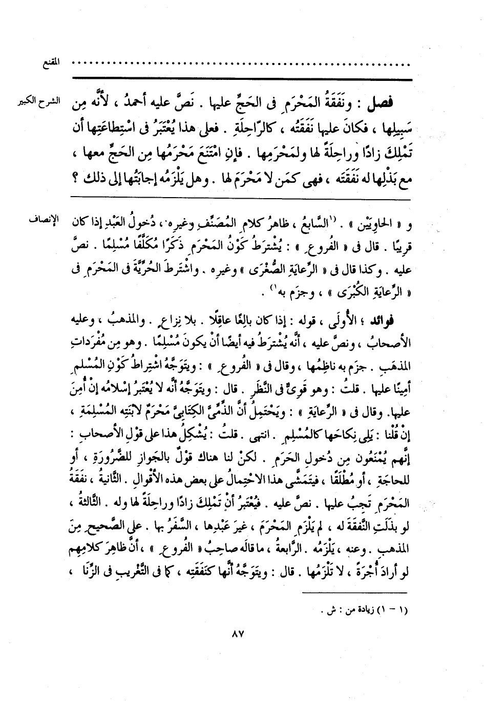 فوائد؛ الأُولَى، قوله: إذا كان بالِغًا عاقِلًا. بلا نِزاعٍ. والمذهبُ، وعليه الأصحابُ، ونصَّ عليه، أنّه يُشْترَطُ فيه أيضًا أنْ يكونَ مُسْلِمًا. وهو مِن مُفْرَداتِ المذهَبِ. جزَم به ناظِمُها، وقال فى «الفُروعِ»: ويتَوَجَّهُ اشْتِراطُ كَوْنِ المُسْلمِ أمِينًا عليها. قلتُ: وهو قَوِيٌّ فى النَّظَرِ. قال: ويتَوَجَّهُ أنَّه لا يُعْتَبرُ إسْلامُه إنْ أُمِنَ عليها. وقال فى «الرِّعايَةِ»: ويَحْتَمِلُ أنَّ الذِّمِّىَّ الكِتَابِىَّ مَحْرَمٌ لابنَتِه المُسْلِمَةِ، إنْ قُلْنا: يَلِى نِكاحَها كالمُسْلِمِ. انتهى. قلتُ: يُشْكِلُ هذا على قوْلِ الأصحابِ: إنَّهم يُمْنَعُون مِن دُخولِ الحَرَمِ. لكنْ لنا هناك قوْلٌ بالجَوازِ للضَّرُورَةِ، أو للحاجَةِ، أو مُطلَقًا، فيتَمَشَّى هذا الاحْتِمالُ على بعض هذه الأقْوالِ. الثَّانيةُ، نفَقَةُ المَحْرَمِ تَجبُ عليها. نصَّ عليه. فيُعْتَبرُ أنْ تَمْلِكَ زادًا وراحِلَةً لها وله. الثَّالثةُ، لو بذَلَتِ النَّفقَةَ له، لم يَلْزَم المَحْرَمَ، غيرَ عَبْدِها، السَّفَرُ بها. على الصَّحيحِ مِنَ المذهبِ. وعنه، يَلْزَمُه. الرَّابعةُ، ما قالَه صاحِبُ «الفُروعِ»، أنَّ ظاهِرَ كلامِهِم لو أرادَ أُجْرَةً، لا تَلْزَمُها. قال: ويتَوَجَّهُ أنَّها كنَفَقَتِه، كما فى التَّغْريبِ فى الزِّنَا،