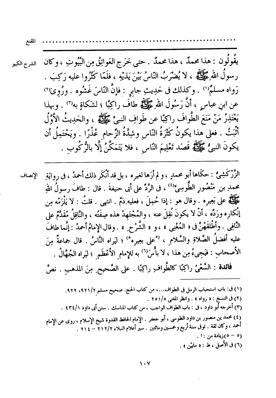 الزَّرْكَشِىُّ: حكَاها أبو محمدٍ، ولم أرَها لغيرِه، بل قد أنْكَر ذلك أحمدُ، فى رِوايَةِ محمدِ بنِ مَنْصُورٍ الطُّوسِىِّ (¬1)، فى الرَّدِّ على أبي حنيفةَ. قال: طافَ رسولُ اللهِ - صلى الله عليه وسلم - على بَعِيرِه. وقال هو: إذا حُمِلَ، فعليه دَمٌ. انتهى. قلتُ: لا يَلْزَمُه مِن إنْكارِه ورَدِّه، أنْ لا يكونَ نُقِلَ عنه، والمُجْتَهِدُ هذه صِفَتُه، والنَّاقِلُ مُقَدَّمٌ على النَّافِى. وأطْلقَهُنَّ فى «المُغْنِى»، و «الشَّرْحِ». وقال الإمامُ أحمدُ: إنَّما طافَ عليه أفضلُ الصَّلاةِ والسَّلامِ، [على بعِيرِه] (¬2)؛ ليَراه النَّاسُ. قال جماعةٌ مِنَ الأصحابِ: فيَجِئُ مِن هذا، لا بأْسَ (¬3) به للإمامِ الأعْظَمِ؛ ليَراه الجُهَّالُ.