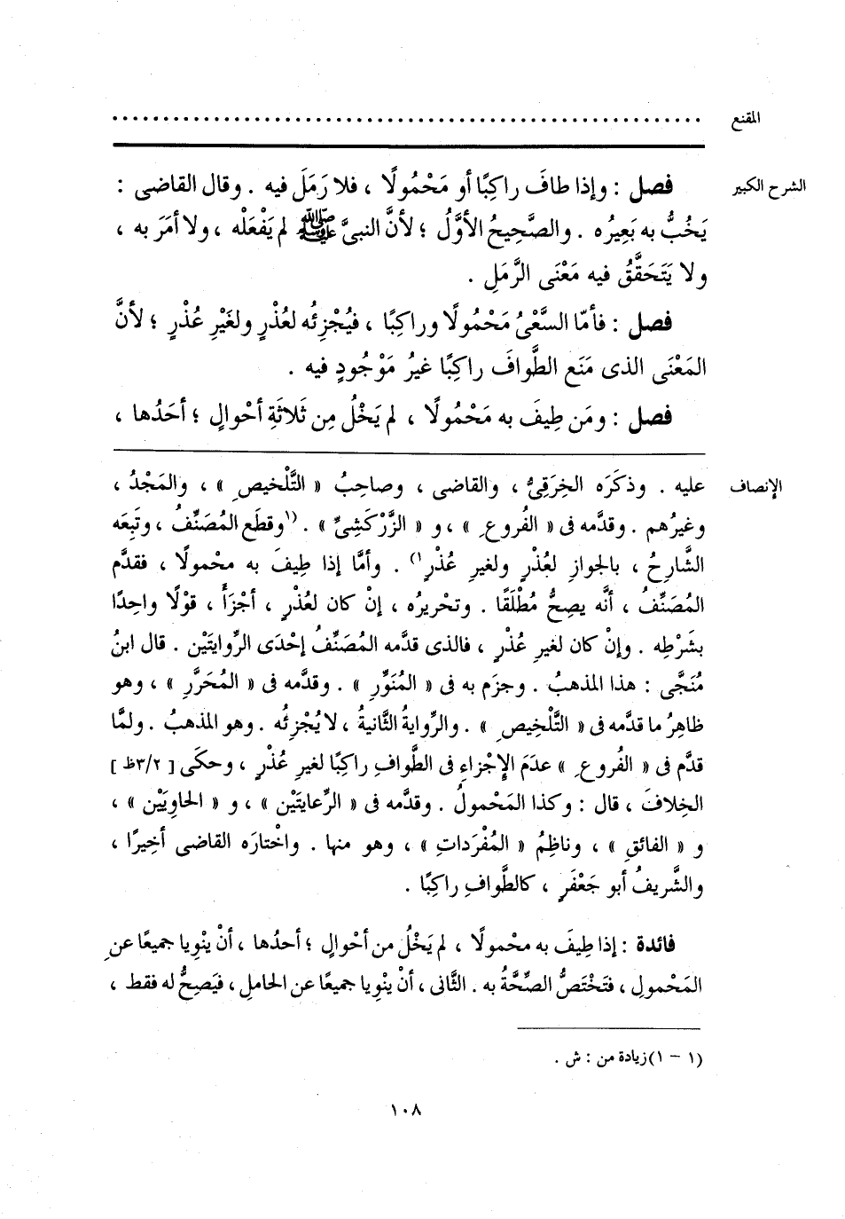 عليه. وذكَرَه الخِرَقِىُّ، والقاضى، وصاحِبُ «التَّلْخيصِ»، والمَجْدُ، وغيرُهم. وقدَّمه فى «الفُروعِ»، و «الزَّرْكَشِيِّ». [وقطَع المُصَنِّفُ، وتَبِعَه الشَّارِحُ، بالجوازِ لعُذْرٍ ولغيرِ عُذْرٍ] (¬1). وأمَّا إذا طِيفَ به محْمولًا، فقدَّم المُصَنِّفُ، أنَّه يصِحُّ مُطْلَقًا. وتحْريرُه، إنْ كان لعُذْرٍ، أجْزَأ، قوْلًا واحِدًا بشَرْطِه. وإنْ كان لغيرِ عُذْرٍ، فالذى قدَّمه المُصَنِّفُ إحْدَى الرِّوايتَيْن. قال ابنُ مُنَجَّى: هذا المذهبُ. وجزَم به فى «المُنَوِّرِ». وقدَّمه فى «المُحَرَّرِ»، وهو ظاهِرُ ما قدَّمه فى «التَّلْخِيصِ». والرِّوايةُ الثَّانيةُ، لا يُجْزِئُه. وهو المذهبُ. ولمَّا قدَّم فى «الفُروعِ» عدَمَ الإجْزاءِ فى الطَّوافِ راكِبًا لغيرِ عُذْرٍ، وحكَى الخِلاف، قال: وكذا المَحْمولُ. وقدمه فى «الرِّعايتَيْن»، و «الحاوِيَيْن»، و «الفائقِ»، وناظِمُ «المفْرَداتِ»، وهو منها. واخْتارَه القاضى أخِيرًا، والشَّريفُ أبو جَعْفَرٍ، كالطَّوافِ راكِبًا.