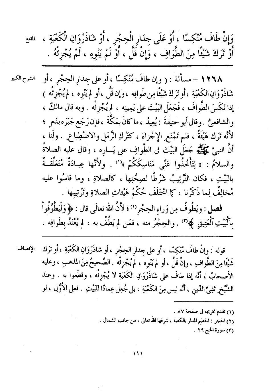 قوله: وإنْ طافَ مُنْكِسًا، أو على جِدارِ الحِجْرِ، أو شاذَرْوَانِ الكَعبَةِ، أو ترَك شَيْئًا مِنَ الطَّوافِ، وإنْ قَلَّ، أو لم يَنْوِه، لم يُجْزِئْه. الصَّحيحُ مِنَ المذهبِ، وعليه الأصحابُ، أنَّه إذا طافَ على شَاذَرْوَانِ الكَعْبَةِ لا يُجْزِئُه، وقطَعوا به. وعندَ الشَّيْخِ تَقِيِّ الدِّينِ، أنَّه ليس مِنَ الكَعْبَةِ، بل جُعِلَ عِمادًا للبَيْت. فعلى الأوَّلِ، لو
