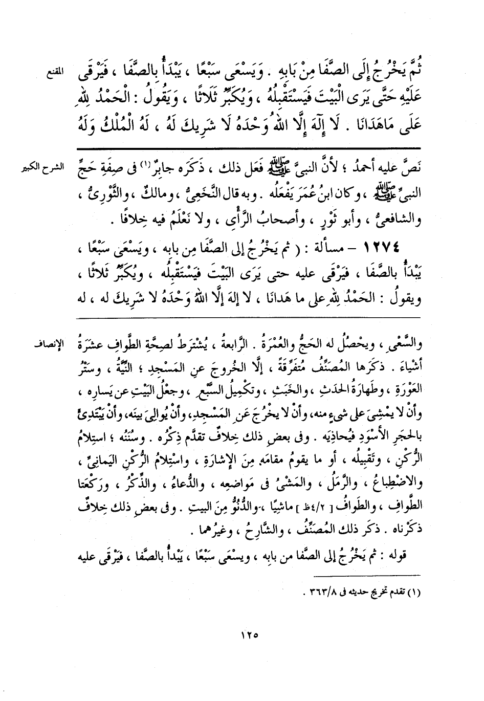 ثُمَّ يَخْرُجُ إِلَى الصَّفَا مِنْ بَابِهِ. وَيَسْعَى سَبْعًا، يَبْدَأُ بِالصَّفَا، فَيَرْقَى عَلَيْهِ حَتَّى يَرَى الْبَيْتَ فَيَسْتَقْبلُهُ، وَيُكَبِّرُ ثَلَاثًا، وَيَقُولُ: الْحَمْدُ للهِ عَلَى مَاهَدَانَا. لَا إِلهَ إِلَّا اللهُ وَحْدَهُ لَا شَرِيكَ لَهُ، لَهُ الْمُلْكُ وَلَهُ
