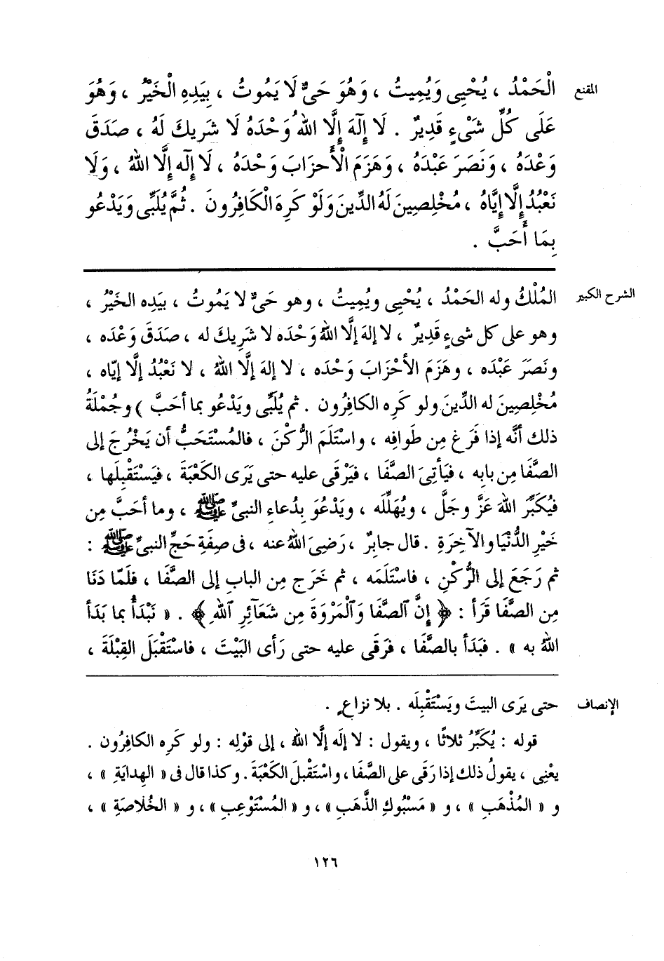 الْحَمْدُ، يُحْيِى وَيُمِيتُ، وَهُوَ حَىٌّ لَا يَمُوتُ، بِيَدِهِ الْخَيْرُ، وَهُوَ عَلَى كُلِّ شَىْءٍ قَدِيرٌ. لَا إِلهَ إِلَّا اللهُ وَحْدَهُ لَا شَريكَ لَهُ، صَدَقَ وَعْدَهُ، وَنَصَرَ عَبْدَهُ، وَهَزَمَ الْأحزَابَ وَحْدَهُ، لَا إِله إِلَّا اللهُ، وَلَا نَعْبُدُ إِلَّا إيَّاهُ، مُخْلِصِينَ لَهُ الدِّينَ وَلَوْ كَرِهَ الْكَافِرُونَ. ثُمَّ يُلَبِّى وَيَدْعُو بِمَا أحَبَّ.