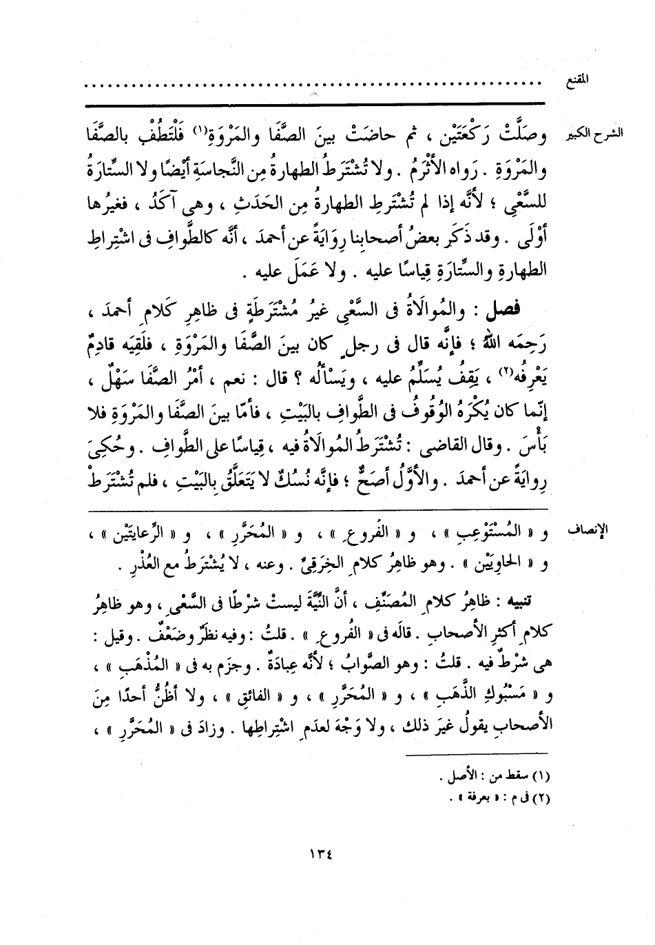 تنبيه: ظاهِرُ كلامِ المُصَنِّفِ، أن النِّيَّةَ ليستْ شرْطًا فى السَّعْىِ، وهو ظاهِرُ كلامِ أكثرِ الأصحابِ. قالَه فى «الفُروعِ». قلتُ: وفيه نظرٌ وضَعْفٌ. وقيل: هى شرْطٌ فيه. قلتُ: وهو الصَّوابُ؛ لأنَّه عِبادَةٌ. وجزَم به فى «المُذْهَبِ»، و «مَسْبُوكِ الذهَبِ»، و «المُحَرَّرِ»، و «الفائقِ»، ولا أظُنُّ أحدًا مِنَ الأصحابِ يقولُ غيرَ ذلك، ولا وَجْهَ لعدَمِ اشْتِراطِها. وزادَ فى «المُحَرَّرِ»،