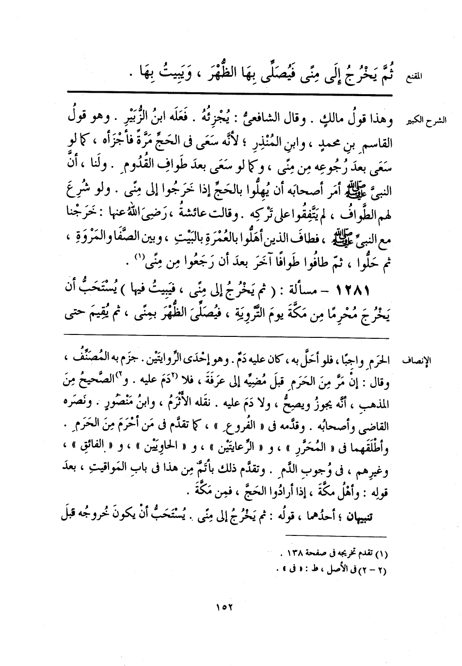 الحرَمِ واجِبًا، فلو أحَلَّ به، كان عليه دَمٌ. وهو إحْدَى الرِّوايتَيْن. جزَم به المُصَنِّفُ، وقال: إنْ مَرَّ مِنَ الحَرَمِ قبلَ مُضِيه إلى عرفَةَ , [فلا دَمَ عليه. و] (¬1) الصَّحيحُ مِنَ المذهبِ، أنَّه يجوزُ ويصِحُّ، ولا دَمَ عليه. نقَله الأَثْرَمُ، وابنُ مَنْصورٍ. ونَصَره القاضى وأصحابُه. وقدمه فى «الفُروعِ»، كما تقدم فى مَن أحْرَمَ مِنَ الحَرَمِ. وأطْلَقَهما فى «المُحَرَّرِ»، و «الرِّعايَتَيْن»، و «الحاوِيَيْن»، و «الفائقِ»، وغيرِهم، فى وُجوبِ الدَّمِ. وتقدَّم ذلك بأتَم مِن هذا فى بابِ المَواقيتِ، بعدَ قولِه: وأهْلُ مكَّةَ، إذا أرادُوا الحَجَّ، فمِن مَكَّةَ.