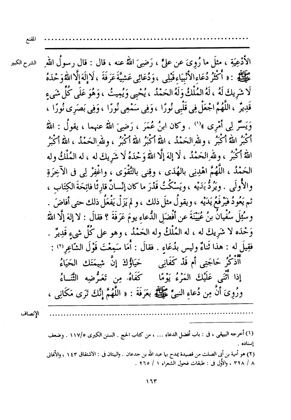 الأَدْعِيَةِ، مثلَ ما رُوِى عن علىٍّ، رَضِىَ اللَّهُ عنه، قال: قال رسولُ اللَّهِ -صلى اللَّه عليه وسلم-: «أَكْثَرُ دُعَاءِ الأنْبِيَاءِ قَبْلِى، وَدُعَائِى عَشِيَّةَ عَرَفَةَ، لَا إِلَهَ إِلَّا اللَّه وَحْدَهُ لَا شَرِيكَ لَه، لَهُ المُلْكُ وَلَهُ الحَمْدُ، يُحْيِى وَيُمِيتُ، وَهُوَ عَلَى كُلِّ شَئٍ قَدِير، اللَّهُمَّ اجْعَلْ فِى قَلْبِى نُورًا، وَفِى سَمْعِى نُورًا، وَفِى بَصَرِى نُورًا، وَيَسِّرْ لِى أمْرِى» (¬1). وكان ابنُ عُمَرَ، رَضِىَ اللَّه عنهما، يقول: اللَّه أكْبَرُ اللَّهُ أكْبَرُ، وللَّهِ الحَمْدُ، اللَّهُ أكْبَرُ اللَّهُ أكْبَرُ، وللَّهِ الحَمْدُ، اللَّهُ أكْبَرُ اللَّهُ أكْبَرُ، وللَّهِ الحَمْدُ، لَا إلهَ إلَّا اللَّه وَحْدَه لَا شَرِيكَ له، له المُلْكُ وله الحَمْدُ، اللَّهُمَّ اهْدِنِى بالهُدَى، وقِنى بالتَّقْوَى، واغْفِرْ لِى في الآخِرَةِ والأُولَى. ويَرُدُّ يَدَيْه، ويَسْكُتُ قَدْرَ ما كان إنْسانٌ قارِئًا فاتِحَةَ الكِتَابِ، ثم يَعُودُ فيَرْفَعُ يَدَيْه، ويقولُ مثلَ ذلك، ولم يَزَلْ يَفْعَلُ ذلك حتى أفاضَ. وسُئِلَ سُفْيانُ بنُ عُيَيْنَةَ عن أفْضَلِ الدُّعاءِ يومَ عَرَفَةَ؟ فقالَ: لا إلهَ إلَّا اللَّهُ وَحْدَه لا شَرِيكَ له، له المُلْكُ وله الحَمْدُ، وهو على كُلِّ شئٍ قَدِيرٌ. فقِيلَ له: هذا ثَناءٌ وليس بدُعَاءٍ. فقالَ: أَمَا سَمِعْتَ قَوْلَ الشّاعِرِ (¬2):