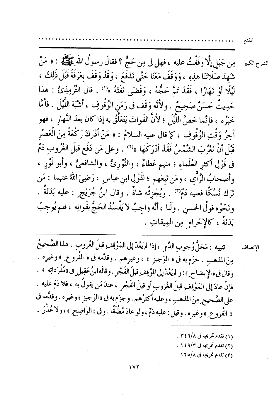 تنبيه: مَحَلُّ وُجوبِ الدَّمِ، إذا لم يَعُدْ إلى المَوْقِفِ قبلَ الغُروبِ. هذا الصَّحيحُ مِنَ المذهبِ. جزَم به فى «الوَجيزِ»، وغيرِهم. وقدَّمه فى «الفُروعِ» وغيرِه. وقال فى «الإِيضاحِ»: ولم يَعُدْ إلى الموْقِفِ قبلَ الفَجْرِ. وقالَه ابنُ عَقِيل فى «مُفْرَداتِه». فإنْ عادَ إلى المَوْقِفِ قبلَ الغُروبِ أو قبلَ الفَجْرِ، عندَ مَن يقولُ به، فلا دَمَ عليه. على الصَّحيحِ مِنَ المذهبِ، وعليه أكثرُهم. وجزَم به فى «الوَجيزِ» وغيرِه. وقدَّمه فى «الفُروعِ» وغيرِه. وقيل: عليه دَمٌ، ولو عادَ مُطْلَقًا. وفى «الواضِحِ»، ولا عُذْرَ.