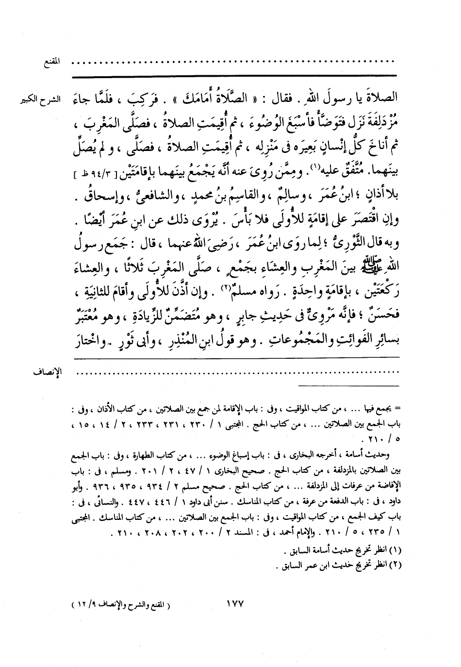 وحديث أسامة، أخرجه البخارى، في: باب إسباغ الوضوء. . .، من كتاب الطهارة، وفى: باب الجمع بين الصلاتين بالمزدلفة، من كتاب الحج. صحيح البخارى 1/ 47، 2/ 201. ومسلم، في باب الإفاضة من عرفات الى المزدلفة. . .، من كتاب الحج. صحيح مسلم 2/ 934، 935، 936. وأبو داود، في: باب الدفعة من عرفة، من كتاب المناسك. سنن أبى داود 1/ 446، 447. والنسائى في: باب كيف الجمع، من كتاب المواقيت، وفى: باب الجمع بين الصلاتين. . .، من كتاب المناسك. المجتبى 1/ 235، 5/ 210. والإمام أحمد، في: المسند 2/ 200، 202، 208، 210.