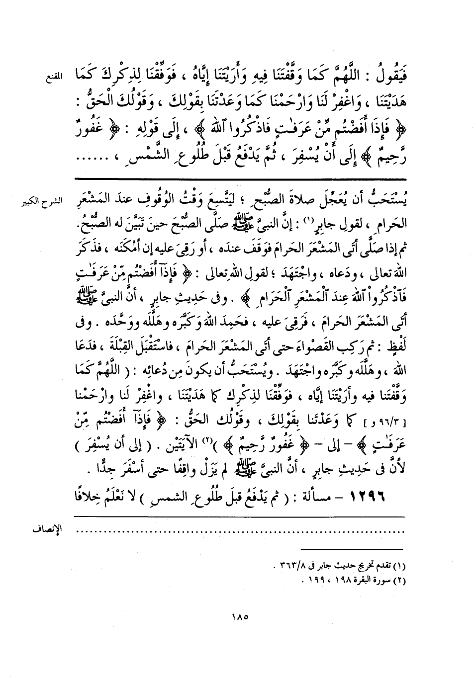 فَيَقُولُ: اللَّهُمَّ كَمَا وَقَّفْتَنَا فِيهِ وَأَرَيْتَنَا إِيَّاهُ، فَوَفِّقْنَا لِذِكْرِكَ كَمَا هَدَيْتَنَا، وَاغْفِرْ لَنَا وَارْحَمْنَا كَمَا وَعَدْتَنَا بقَوْلِكَ، وَقَوْلُكَ الْحَقُّ: {فَإِذَا أَفَضْتُمْ مِنْ عَرَفَاتٍ فَاذْكُرُوا اللَّهَ}، إِلَى قَوْلِهِ: {غَفُورٌ رَحِيمٌ} إِلَى أَنْ يُسْفِرَ، ثُمَّ يَدْفَعُ قَبْلَ طُلُوعِ الشَّمْسِ،