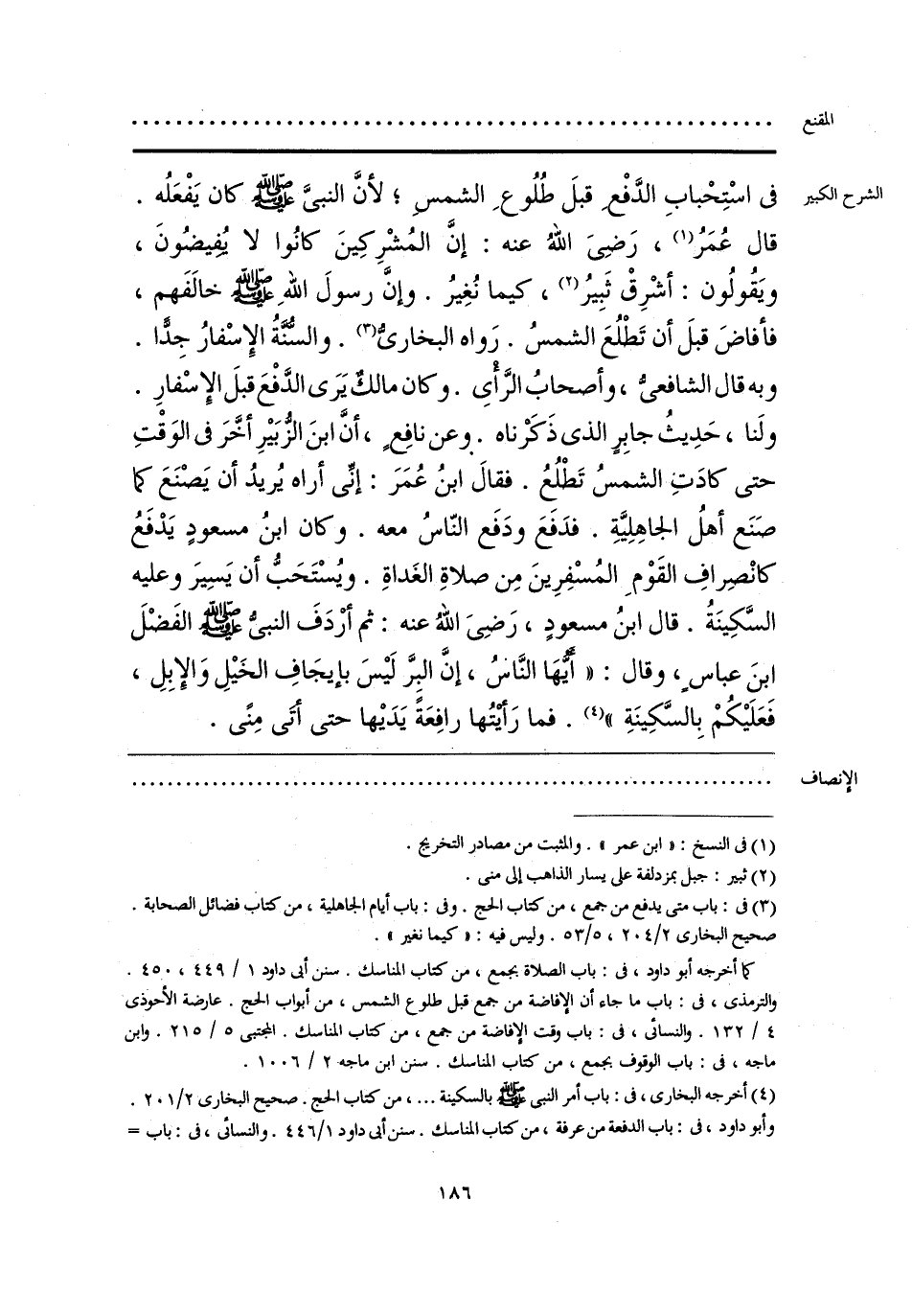 في اسْتِحْبابِ الدَّفْع قبلَ طُلُوعِ الشمس؛ لأنَّ النبىَّ -صلى اللَّه عليه وسلم- كان يَفْعَلُه. قال عُمَرُ (¬1)، رَضِىَ اللَّهُ عنه: إنَّ المُشْرِكِينَ كانُوا لا يُفِيضُونَ، ويَقُولُون؛ أشْرِقْ ثَبِيرُ (¬2)، كيما نُغِيرُ. وإنَّ رسولَ اللَّه -صلى اللَّه عليه وسلم- خالَفَهم، فأفاضَ قبلَ أن تَطْلُعَ الشمسُ. رَواه البخارىُّ (¬3). والسُّنَّة الإِسْفارُ جِدًّا. وبه قال الشافعىُّ، وأصحابُ الرَّأْى. وكان مالكٌ يَرَى الدَّفْعَ قبلَ الإِسْفارِ. ولَنا، حَدِيثُ جابِرٍ الذى ذَكَرْناه. وعن نافِعٍ، أنَّ ابنَ الزُّبَيْرِ أخَّرَ في الوَقْتِ حتى كادَت الشمسُ تَطْلُعُ. فقالَ ابنُ عُمَرَ: إنِّى أراه يُريدُ أن يَصْنَعَ كما صَنَع أهلُ الجاهِلِيَّةِ. فدَفعَ ودَفَع النّاسُ معه. وكان ابنُ مسعودٍ يَدْفَعُ كانْصِرافِ القَوْمِ المُسْفِرِينَ مِن صلاةِ الغَداةِ. ويُسْتَحَبُّ أن يَسِيرَ وعليه السَّكِينَةُ. قال ابنُ مسعودٍ، رَضِىَ اللَّهُ عنه: ثم أرْدَفَ النبىُّ -صلى اللَّه عليه وسلم- الفَضْلَ ابنَ عباسٍ، وقال: «أَيُّهَا النَّاسُ، إنَّ البِرَّ لَيْسَ بإيجَافِ الخَيْلِ وَالإِبِلِ، فَعَلَيْكُمْ بِالسَّكِينَةِ» (¬4). فما رَأيتُها رافِعَةً يَدَيْها حتى أتَى مِنًى.