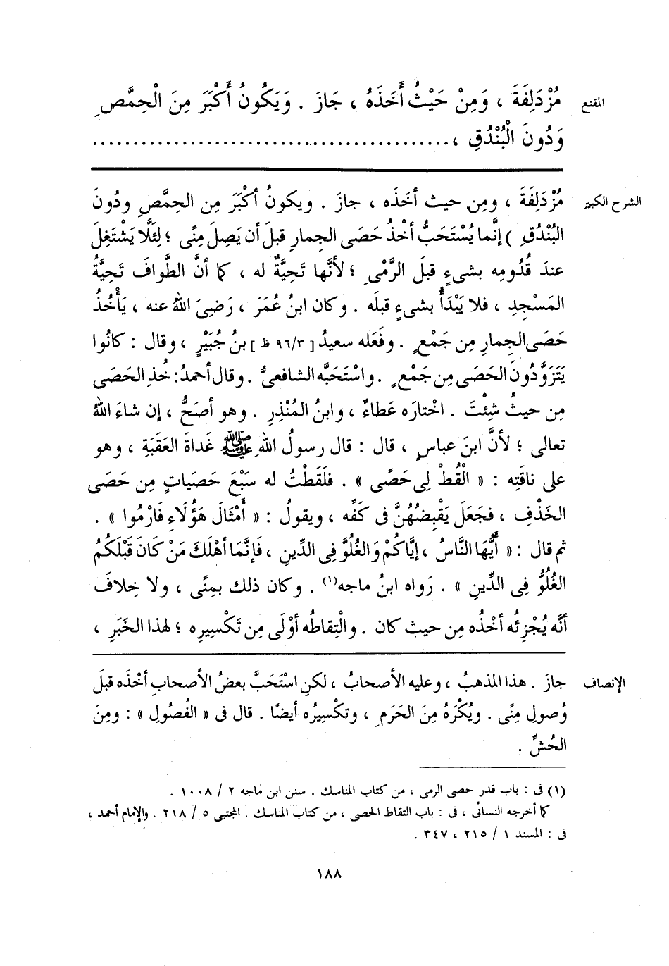 جازَ. هذا المذهبُ، وعليه الأصحابُ، لكنِ اسْتَحَبَّ بعضُ الأصحابِ أخْذَه قبلَ وُصولِ مِنًى. ويُكْرَهُ مِنَ الحَرَمِ، وتكْسِيرُه أيضًا. قال فى «الفُصُولِ»: ومِنَ الحُشِّ.