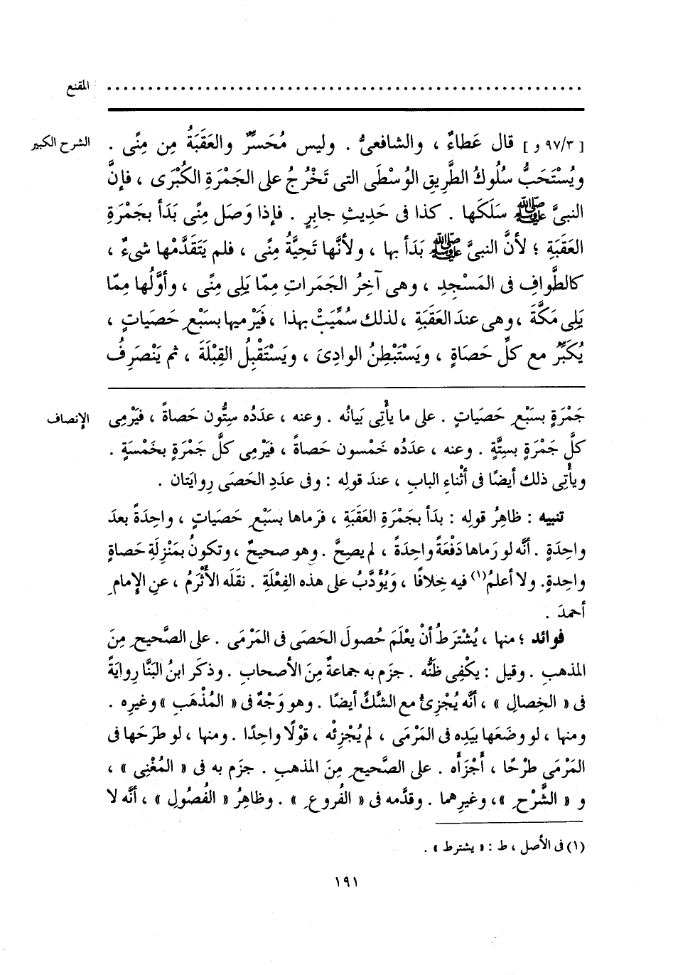 جَمْرَةٍ بسَبْع حَصَياتٍ. على ما يأْتى بَيانُه. وعنه، عدَدُه سِتُّون حَصاةً، فيَرْمِى كلَّ جَمْرَةٍ بسِتَّةٍ. وعنه، عدَدُه خَمْسون حَصاةً، فيَرْمِى كلَّ جَمْرَةٍ بخَمْسَةٍ. ويأْتِى ذلك أيضًا فى أثْناءِ البابِ، عندَ قولِه: وفى عدَدِ الحَصَى رِوايَتان.