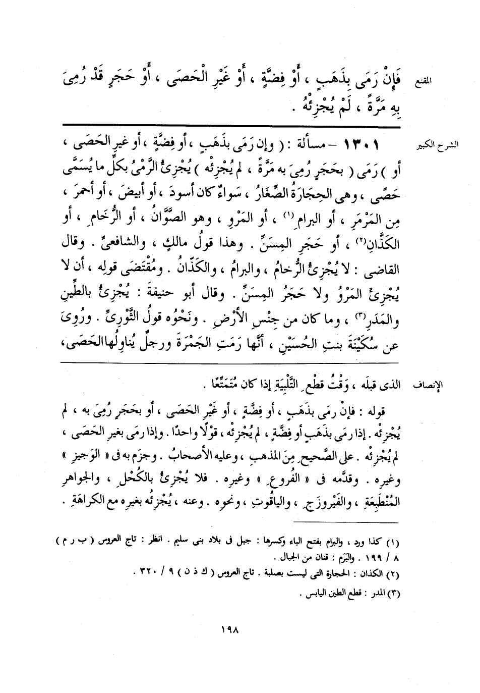 قوله: فإنْ رمَى بذَهَبٍ، أو فِضةٍ، أو غَيْرِ الحَصَى، أو بحَجَرٍ رُمِىَ به، لم يُجْزِئْه. إذا رمَى بذَهَبٍ أو فِضةٍ، لم يُجْزِئْه، قوْلًا واحدًا. وإذا رمَى بغيرِ الحَصَى، لم يُجْزِئْه. على الصَّحيحِ مِنَ المذهبِ، وعليه الأصحابُ. وجزَم به فى «الوَجيزِ» وغيرِه. وقدَّمه فى «الفُروعِ» وغيرِه. فلا يُجْزِئُ بالكُحْلِ، والجواهرِ المُنْطَبِعَةِ، والفَيْروزَجِ، والياقُوتِ، ونحوِه. وعنه، يُجْزِئُه بغيرِه مع الكراهَةِ.