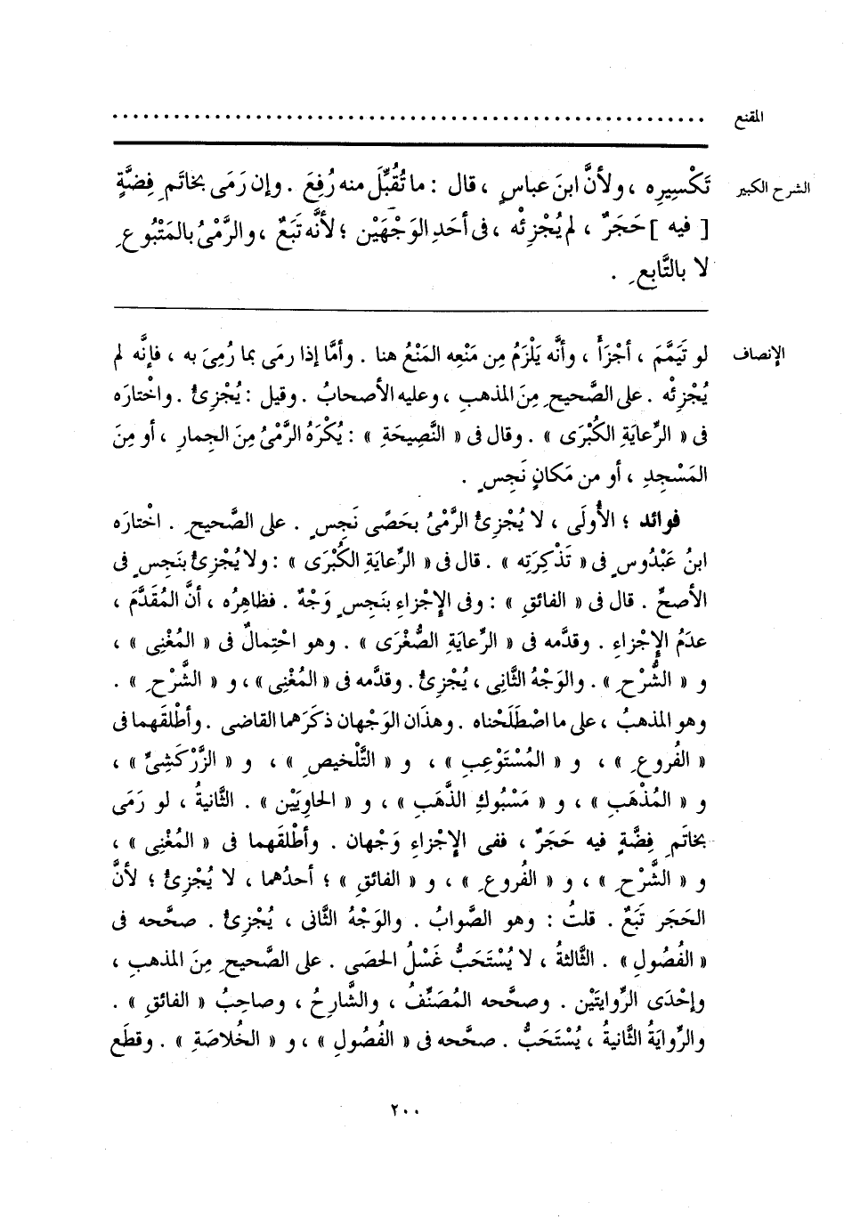 فوائد؛ الأُولَى، لا يُجْزِئُ؛ الرَّمْىُ بحَصًى نَجِسٍ. على الصَّحيحِ. اخْتارَه ابنُ عَبْدُوسٍ فى «تَذْكِرَتِه». قال فى «الرِّعايَةِ الكُبْرَى»: ولا يُجْزِئُ بنَجِسٍ فى الأصحِّ. قال فى «الفائقِ»: وفى الإِجْزاءِ بنَجِسٍ وَجْهٌ. فظاهِرُه، أنَّ المُقَدَّمَ، عدَمُ الإِجْزاءِ. وقدَّمه فى «الرِّعايَةِ الصُّغْرَى». وهو احْتِمال فى «المُغْنِى»، و «الشَّرْحِ». والوَجْهُ الثَّانِى، يُجْزِئُ. وقدَّمه فى «المُغْنِى»، و «الشَّرْحِ». وهو المذهبُ، على ما اصْطَلَحْناه. وهذَان الوَجْهان ذكَرَهما القاضى. وأطْلقَهما فى «الفُروعِ»، و «المُسْتَوْعِبِ»، و «التَّلْخيصِ»، و «الزَّرْكَشِىِّ»، و «المُذْهَبِ»، و «مَسْبُوكِ الذَّهَبِ»، و «الحاوِيَيْن». الثَّانيةُ، لو رَمَى بخاتَمِ فِضَّةٍ فيه حَجَرٌ، ففى الإِجْزاءِ وَجْهان. وأطْلقَهما فى «المُغْنِى»، و «الشَّرْحِ»، و «الفُروعِ»، و «الفائقِ»؛ أحدُهما، لا يُجْزِئُ؛ لأنَّ الحَجَر تَبَعٌ. قلتُ: وهو الصَّوابُ. والوَجْهُ الثَّانى، يُجْزِئُ. صحَّحه فى «الفُصُولِ». الثَّالثةُ، لا يُسْتَحَبُّ غَسْلُ الحصَى. على الصَّحيحِ مِنَ المذهبِ، وإحْدَى الرِّوايتَيْن. وصحَّحه المُصَنِّفُ، والشَّارِحُ، وصاحِبُ «الفائقِ». والرِّوايَةُ الثَّانيةُ، يُسْتَحَبُّ. صحَّحه فى «الفُصُولِ»، و «الخُلاصَةِ». وقطَع