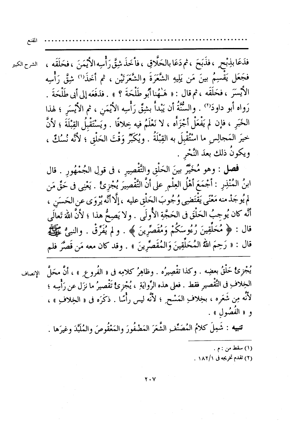يُجْزِئُ حَلْقُ بعضِه. وكذا تقْصِيرُه. وظاهِرُ كلامِه فى «الفُروعِ»، أنَّ محَلَّ الخِلافِ فى التَّقْصيرِ فقط. فعلى هذه الرِّوايَةِ، يُجْزِئُ تَقْصيرُ ما نزَل عن رَأْسِه؛ لأنَّه مِن شَعَرِه، بخِلافِ المَسْحِ؛ لأنَّه ليس رأْسًا. ذكَرَه فى «الخِلافِ»، و «الفُصُولِ».