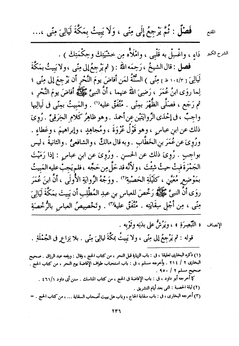 قوله: ثم يَرْجِعُ إلى مِنًى، ولا يَبِيتُ بمكَّةَ ليالِىَ مِنًى. بلا نِزاعٍ فى الجُمْلَةِ.