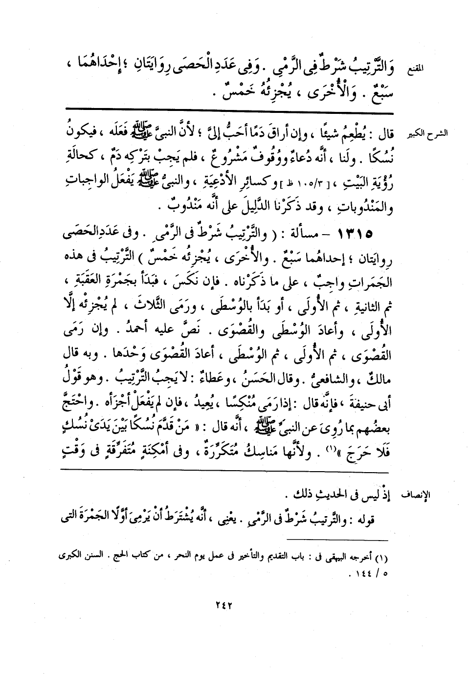 وَالتَّرتِيبُ شَرْطٌ فِى الرَّمْى. وَفِى عَدَدِ الْحَصَى رِوَايَتَانِ؛ إِحْدَاهُمَا، سَبْعٌ. وَالْأُخْرَى، يُجْزِئُهُ خَمْسٌ.