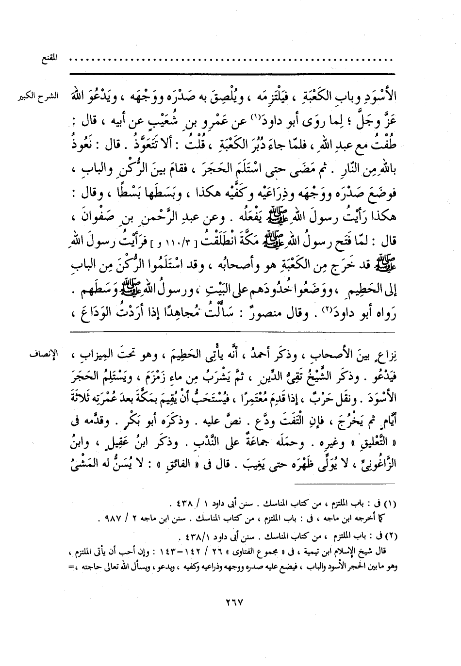 نِزاعٍ بينَ الأصحابِ، وذكَر أحمدُ، أنَّه يأْتِى الحَطِيمَ، وهو تحتَ المِيزابِ، فيَدْعُو. وذكَر الشَّيْخُ تَقِىُّ الدِّينِ، ثمَّ يَشْرَبُ مِن ماءِ زَمْزَمَ، ويَسْتَلِمُ الحَجَرَ الأسْوَدَ. ونقَل حَرْبٌ، إذا قَدِمَ مُعْتَمِرًا، فيُسْتَحَبُّ أنْ يُقِيمَ بمَكَّةَ بعدَ عُمْرَتِه ثَلَاثَةَ أيَّامٍ ثم يَخْرُجَ، فإنِ الْتَفَتَ ودَّع. نصَّ عليه. وذكَرَه أبو بَكْرٍ. وقدَّمه فى «التَّعْليقِ» وغيرِه. وحمَلَه جماعَةٌ على النَّدْبِ. وذكَر ابنُ عَقِيلٍ، وابنُ الزَّاغُونِىِّ، لا يُوَلِّى ظَهْرَه حتى يَغِيبَ. قال فى «الفائقِ»: لا يُسَنُّ له المَشْىُ