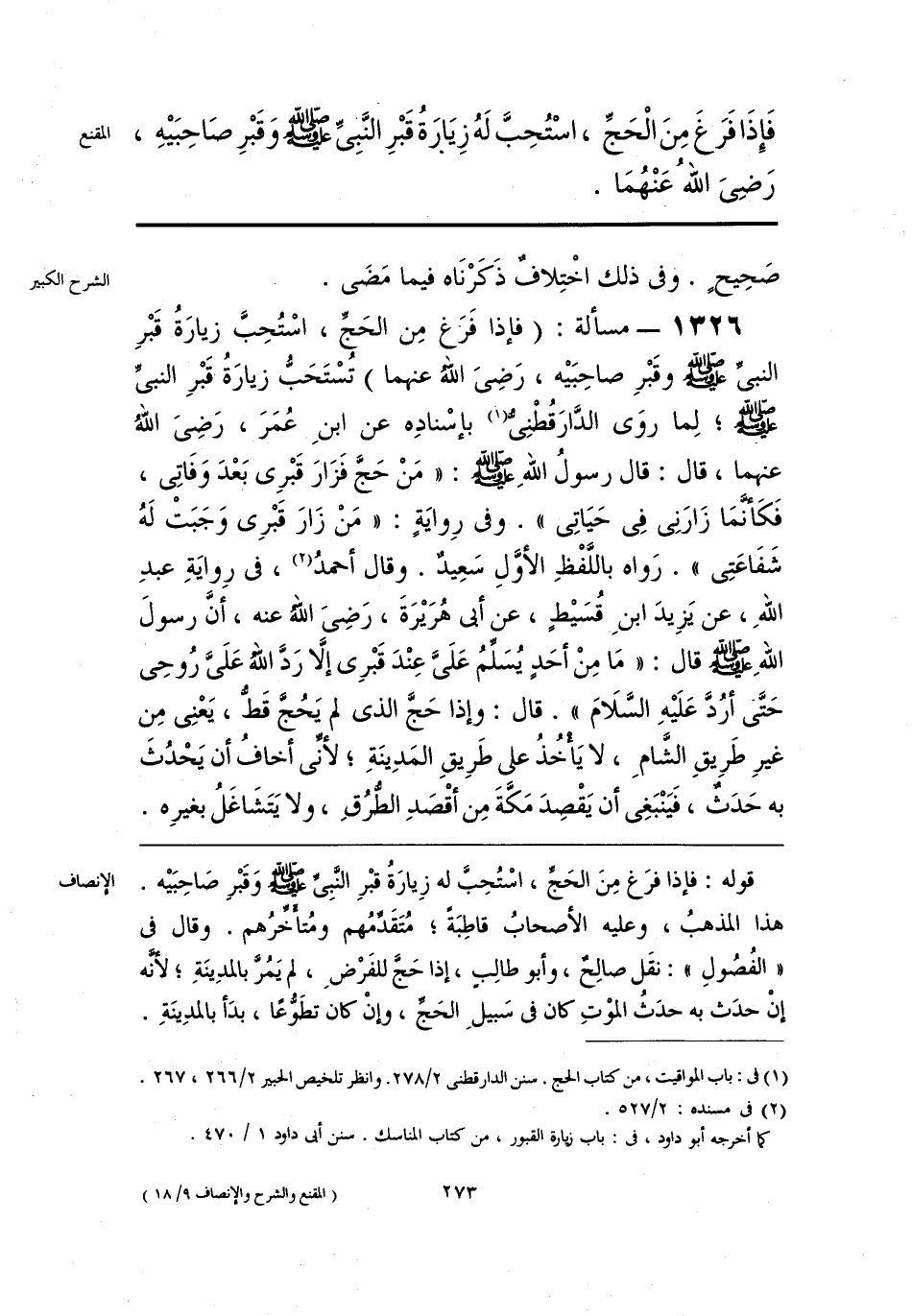 قوله: فإذا فرَغ مِنَ الحَجِّ، اسْتُحِبَّ له زِيارَةُ قبْرِ النَّبِىِّ -صلى اللَّه عليه وسلم- وَقَبْرِ صَاحِبَيْه. هذا المذهبُ، وعليه الأصحابُ قاطِبَةً؛ مُتَقَدِّمُهم ومُتأخِّرُهم. وقال فى «الفُصُولِ»: نقَل صالِحٌ، وأبو طالِبٍ، إذا حَجَّ للفَرْضِ، لم يَمُرَّ بالمدِينَةِ؛ لأنَّه إنْ حدَث به حدَثُ الموْتِ كان فى سَبيلِ الحَجِّ، وإنْ كان تطَوُّعًا، بدَأ بالمدِينَةِ.