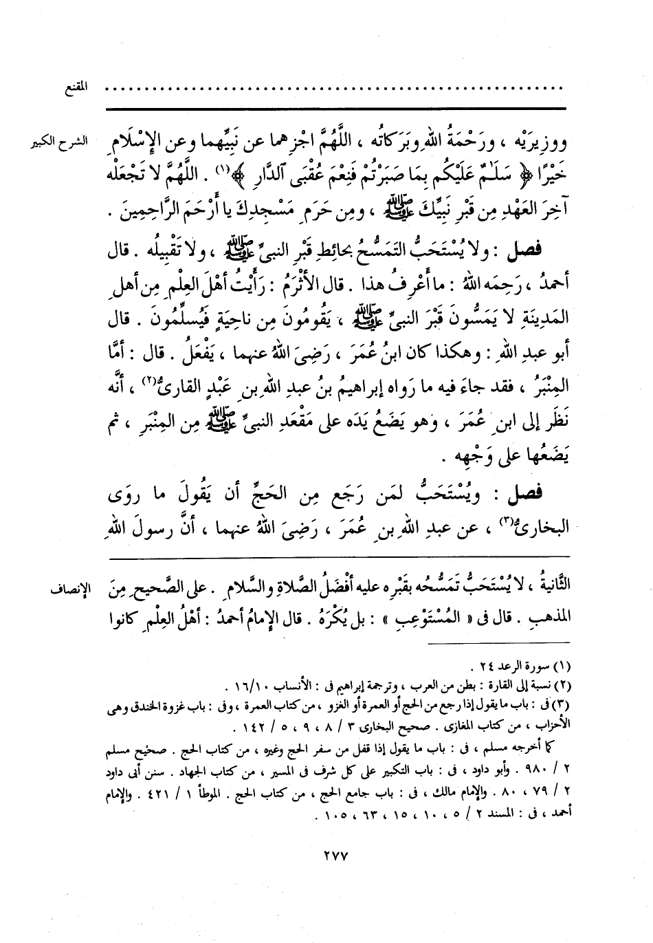 الثَّانيةُ، لا يُسْتَحَبُّ تَمَسُّحُه بقَبْرِه عليه أفْضَلُ الصَّلاةِ والسَّلامِ. على الصَّحيحِ مِنَ المذهبِ. قال فى «المُسْتَوْعِبِ»: بل يُكْرَهُ. قال الإِمامُ أحمدُ: أهْلُ العِلْمِ كانوا