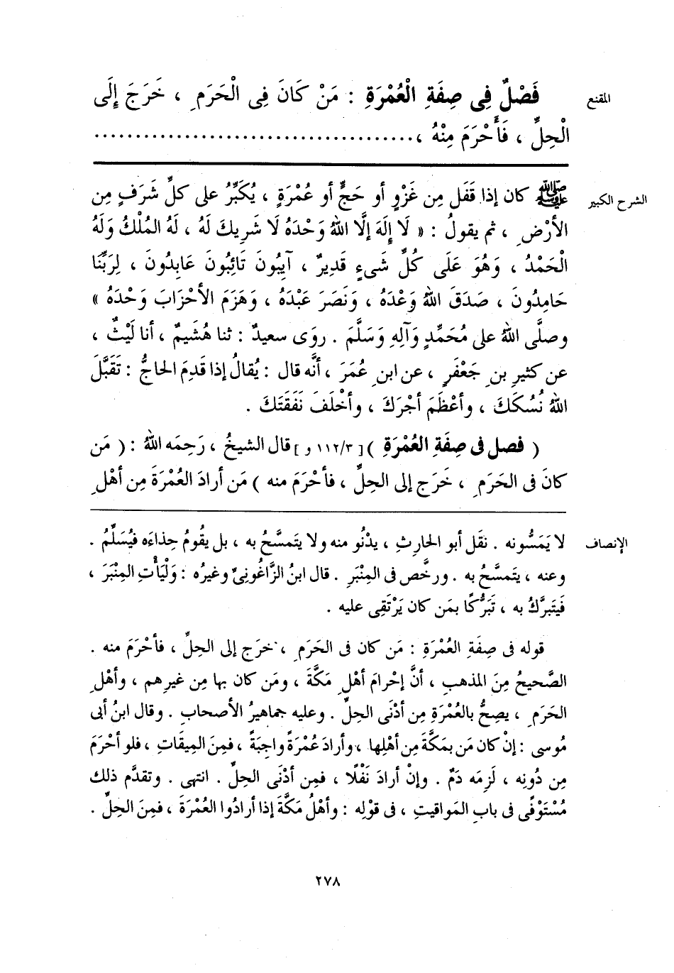 قوله فى صِفَةِ العُمْرَةِ: من كان فى الحَرَمِ، خرَج إلى الحِلِّ، فأحْرَمَ منه. الصَّحيحُ مِنَ المذهبِ، أنَّ إحْرامَ أهْلِ مَكَّةَ، ومَن كان بها مِن غيرِهم، وأهْلِ الحَرَمِ، يصِحُّ بالعُمْرَةِ مِن أدْنَى الحِلِّ. وعليه جماهيرُ الأصحابِ. وقال ابنُ أبى مُوسى: إنْ كان مَن بمَكَّةَ مِن أهْلِها، وأرادَ عُمْرَةً واجِبَةً، فمِنَ المِيقَاتِ، فلو أحْرَمَ مِن دُونِه، لَزِمَه دَمٌ. وإنْ أرادَ نَفْلًا، فمِن أدْنَى الحِلِّ. انتهى. وتقدَّم ذلك مُسْتَوْفًى فى بابِ المَواقيتِ، فى قوْلِه: وأهْلُ مَكَّةَ إذا أرادُوا العُمْرَةَ، فمِنَ الحِلِّ.