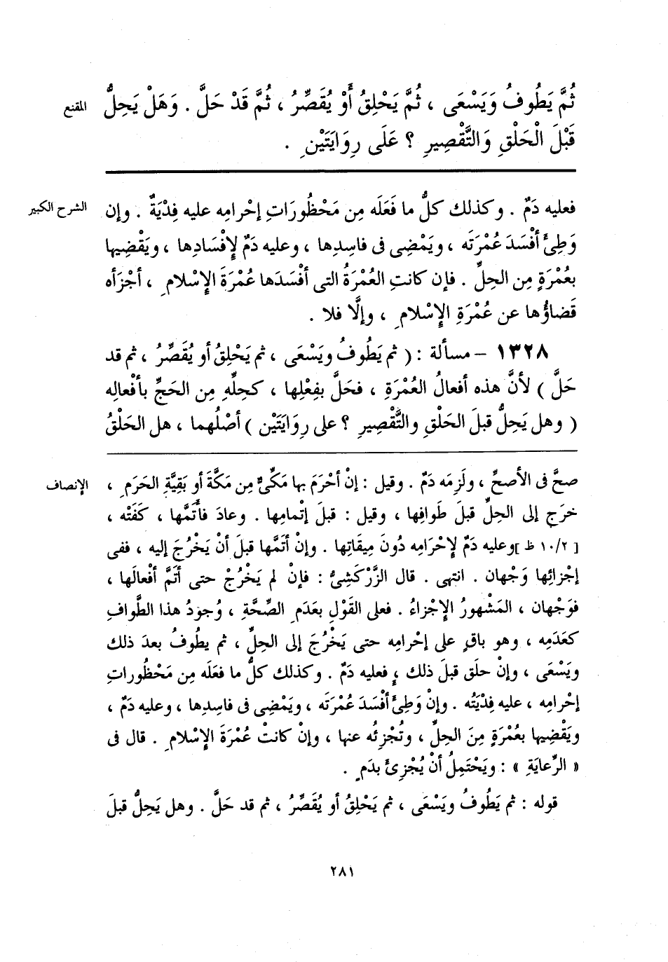 ثُمَّ يَطُوفُ وَيَسْعَى، ثُمَّ يَحْلِقُ أوْ يُقَصِّرُ، ثُمَّ قَدْ حَلَّ. وَهَلْ يَحِلُّ قَبْلَ الْحَلْقِ وَالتَّقْصِيرِ؟ عَلَى رِوَايَتَيْنِ.