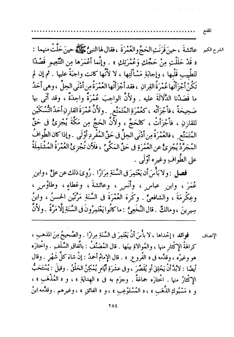 فوائد؛ إحْداها، لا بأْسَ أنْ يَعْتَمِرَ فى السَّنَةِ مِرارًا. والصَّحيحُ مِنَ المذهبِ، كراهَةُ الإِكْثارِ منها، والمُوالاةِ بينَها. قال المُصَنِّفُ: باتفاقِ السَّلَفِ. واخْتارَه هو وغيرُه، وقدَّمه فى «الفُروعِ». قال الإِمامُ أحمدُ: إنْ شاءَ كلَّ شَهْرٍ. وقال أيضًا: لابدَّ أنْ يَحْلِقَ أو يُقَصِّر، وفى عشَرَةِ أَيَّامٍ يُمْكِنُ الحَلْقُ. وقيلَ: يُسْتَحَبُّ الإكْثارُ منها. اخْتارَه جماعَةٌ. وجزَم به فى «الهِدايَةِ»، و «المُذْهَبِ»، و «مَسْبُوكِ الذَّهَبِ»، و «المُسْتَوْعِبِ»، و «الفائقِ»، وغيرِهم. وقدَّمه ابنُ