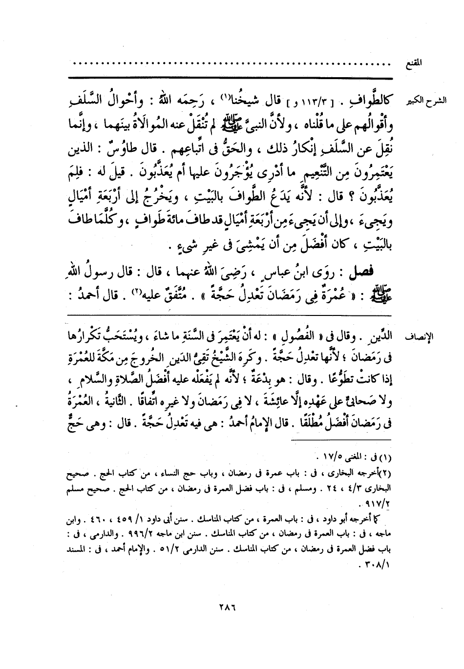 الدِّينِ. وقال فى «الفُصُولِ»: له أنْ يَعْتَمِرَ فى السَّنَةِ ما شاءَ، ويُسْتَحَبُّ تَكْرارُها فى رَمَضانَ؛ لأنها تعْدِلُ حَجَّةً. وكَرِهَ الشيْخُ تَقِىُّ الدَّينِ الخُروجَ مِن مَكةَ للعُمْرَةِ إذا كانتْ تطَوُّعًا. وقال: هو بِدْعَةٌ؛ لأنَّه لم يَفْعَلْه عليه أفْضَلُ الصَّلاةِ والسَّلامِ، ولا صَحابىٌّ على عَهْدِه إلَّا عائِشَةَ، لا فِى رَمَضانَ ولا غيرِه اتِّفاقًا. الثَّانيةُ، العُمْرَةُ فى رَمَضانَ أفْضَلُ مُطْلَقًا. قال الإِمامُ أحمدُ: هى فيه تَعْدِلُ حَجَّةً. قال: وهى حَجٌّ