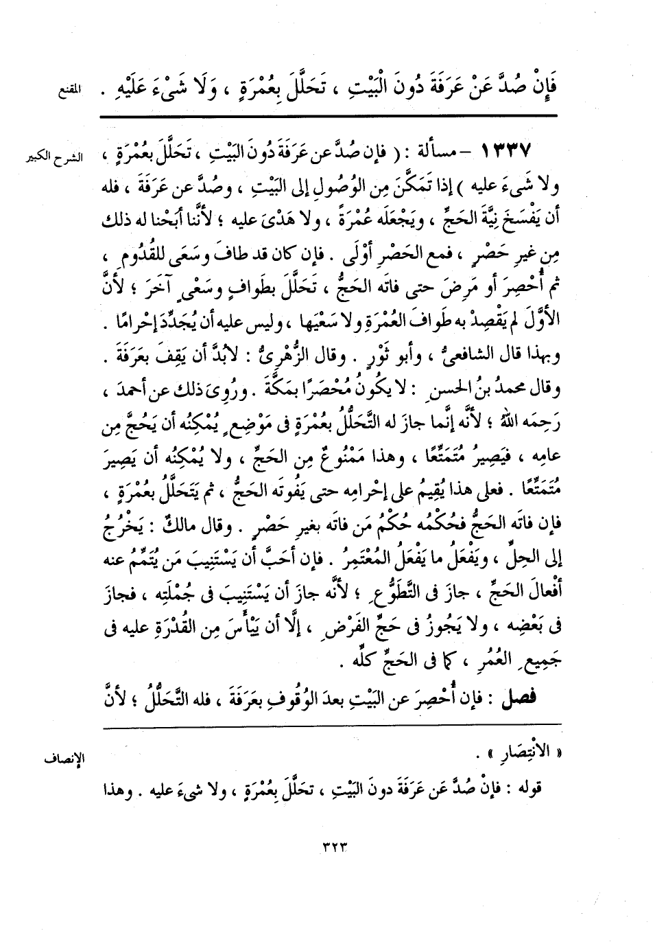 قوله: فإنْ صُدَّ عَن عَرَفَةَ دونَ البَيْتِ، تحَلَّلَ بِعُمْرَةٍ، ولا شئَ عليه. وهذا