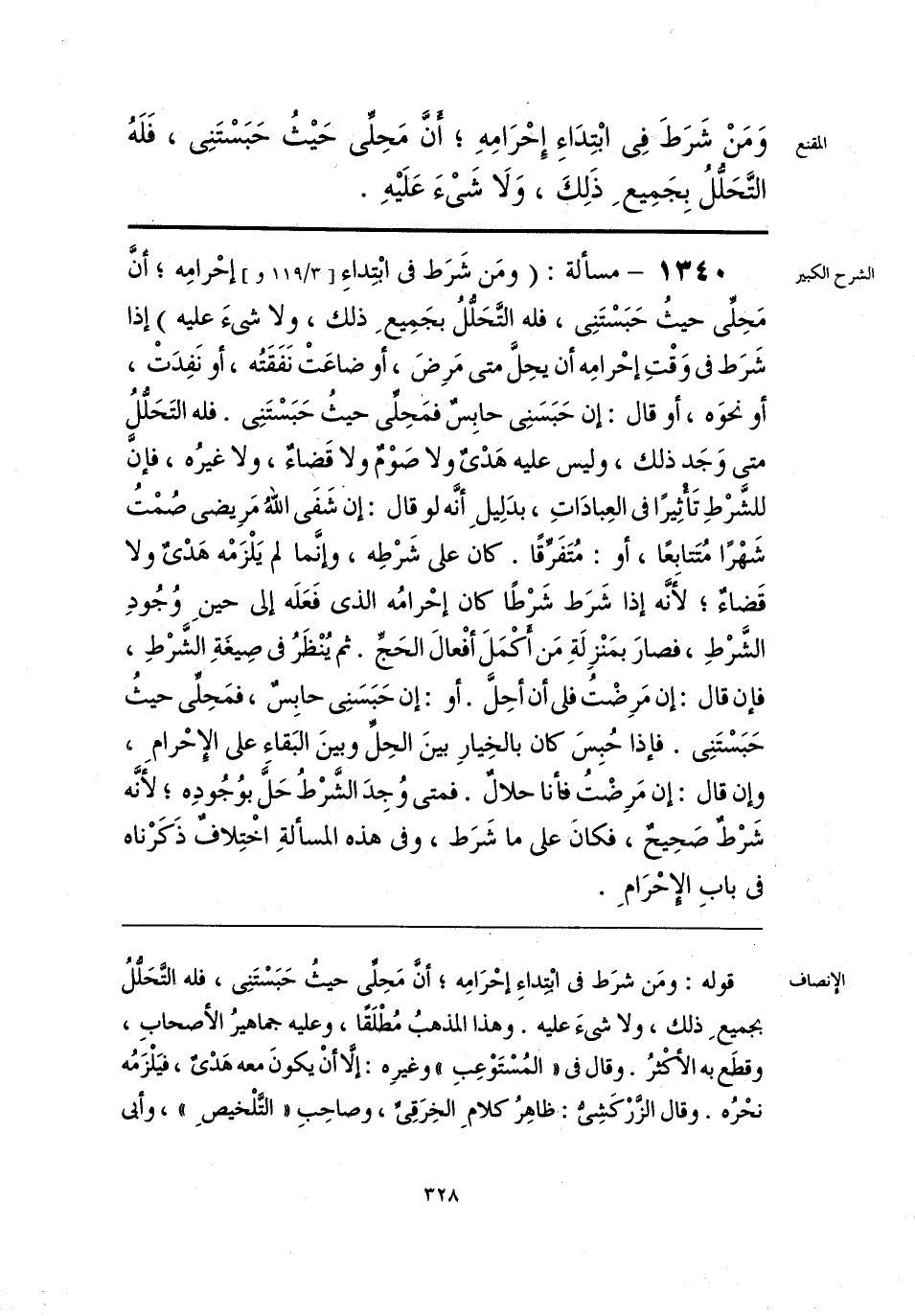 وَمَنْ شَرَطَ فِى ابْتِدَاءِ إِحْرَامِهِ؛ أنَّ مَحِلِّى حَيْثُ حَبَسْتَنِى، فَلَهُ التَّحَلُّلُ بِجَمِيعِ ذَلِكَ، وَلَا شَىْءَ عَلَيْهِ.