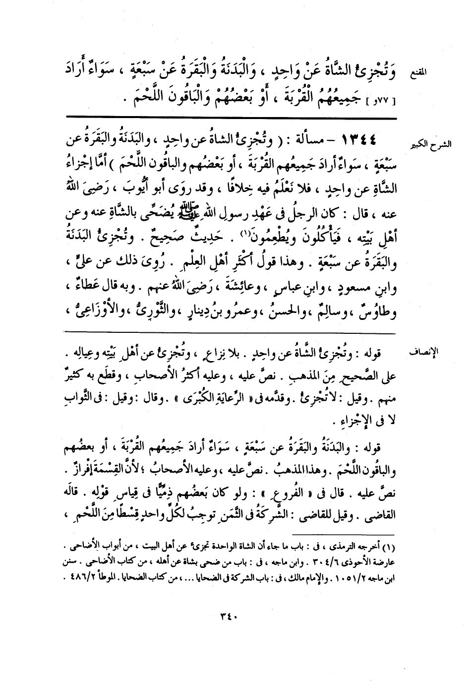 قوله: وتُجْزِئُ الشَّاةُ عن واحِدٍ. بلا نِزاعٍ، وتُجْزِئُ عن أهْلِ بَيْتِه وعِيالِه. على الصَّحيح مِنَ المذهبِ. نصَّ عليه، وعليه أكثرُ الأصحابِ، وقطَع به كثيرٌ منهم. وقيل: لا تُجْزِئُ. وقدَّمه فى «الرِّعايَةِ الكُبْرَى». وقال: وقيل: فى الثَّوابِ لا فى الإِجْزاءِ.