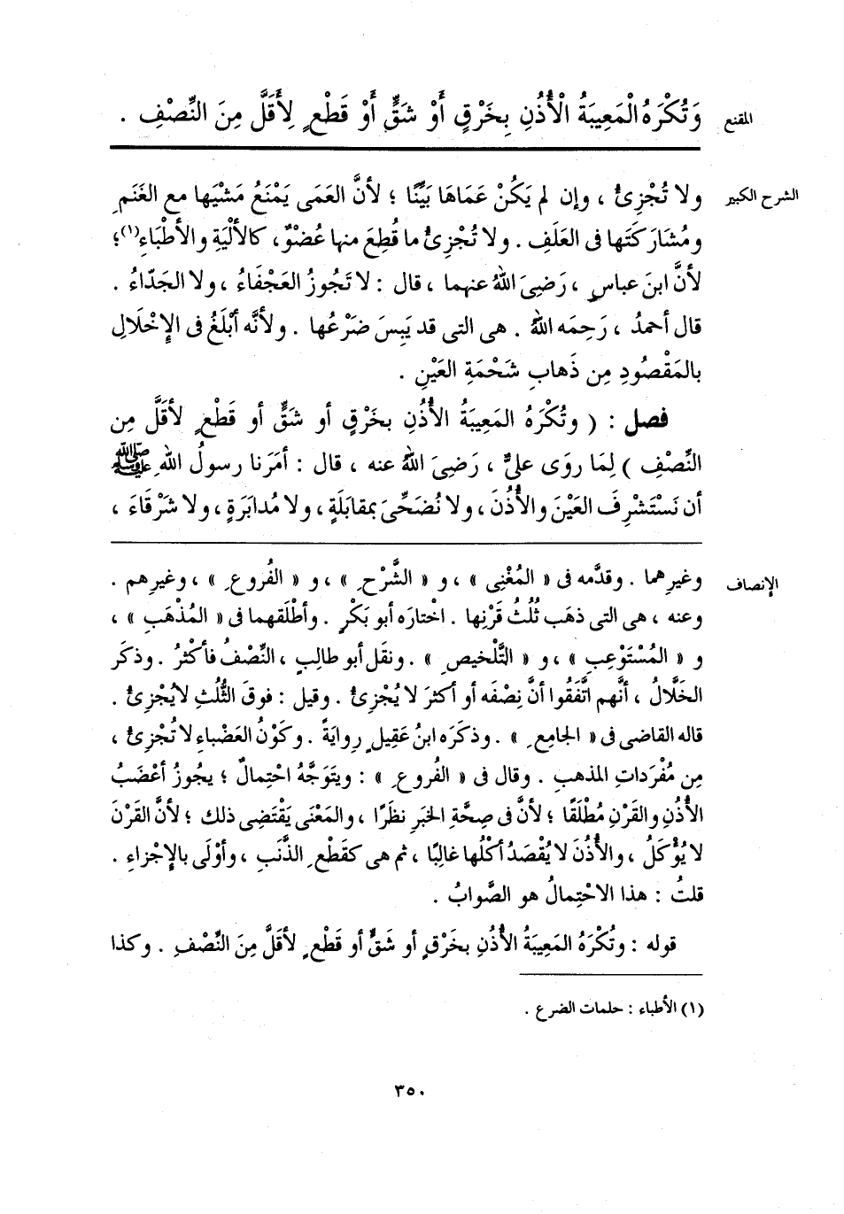 وغيرِهما. وقدَّمه فى «المُغْنِى»، و «الشَّرْحِ»، و «الفُروعِ»، وغيرِهم. وعنه، هى التى ذهَب ثُلُثُ قَرْنِها. اخْتارَه أبو بَكْرٍ. وأطْلَقهما فى «المُذْهَبِ»، و «المُسْتَوْعِب»، و «التَّلْخيصِ». ونقَل أبو طالِبٍ، النِّصْفُ فأكْثرُ. وذكَر الخَلَّالُ، أنَّهم اتَّفَقُوا أنَّ نِصْفَه أو أكثرَ لا يُجْزِئُ. وقيل: فوقَ الثُّلُثِ لا يُجْزِئُ. قاله القاضى فى «الجامِعِ». وذكَرَه ابنُ عَقِيلٍ رِوايَةً. وكَوْنُ العَضْباءِ لا تُجْزِئُ، مِن مُفْرَداتِ المذهبِ. وقال فى «الفُروعِ»: ويتَوَجَّهُ احْتِمالُ؛ يجُوزُ أعْضَبُ الأُذُنِ والقَرْنِ مُطْلَقًا؛ لأنَّ فى صِحَّةِ الخبَرِ نظَرًا، والمَعْنَى يَقْتَضِى ذلك؛ لأنَّ القَرْنَ لا يُؤْكَلُ، والأُذُنَ لا يُقْصَدُ أكْلُها غالِبًا، ثم هى كقَطْعِ الذَّنَبِ، وأوْلَى بالإِجْزاءِ. قلتُ: هذا الاحْتِمالُ هو الصَّوابُ.