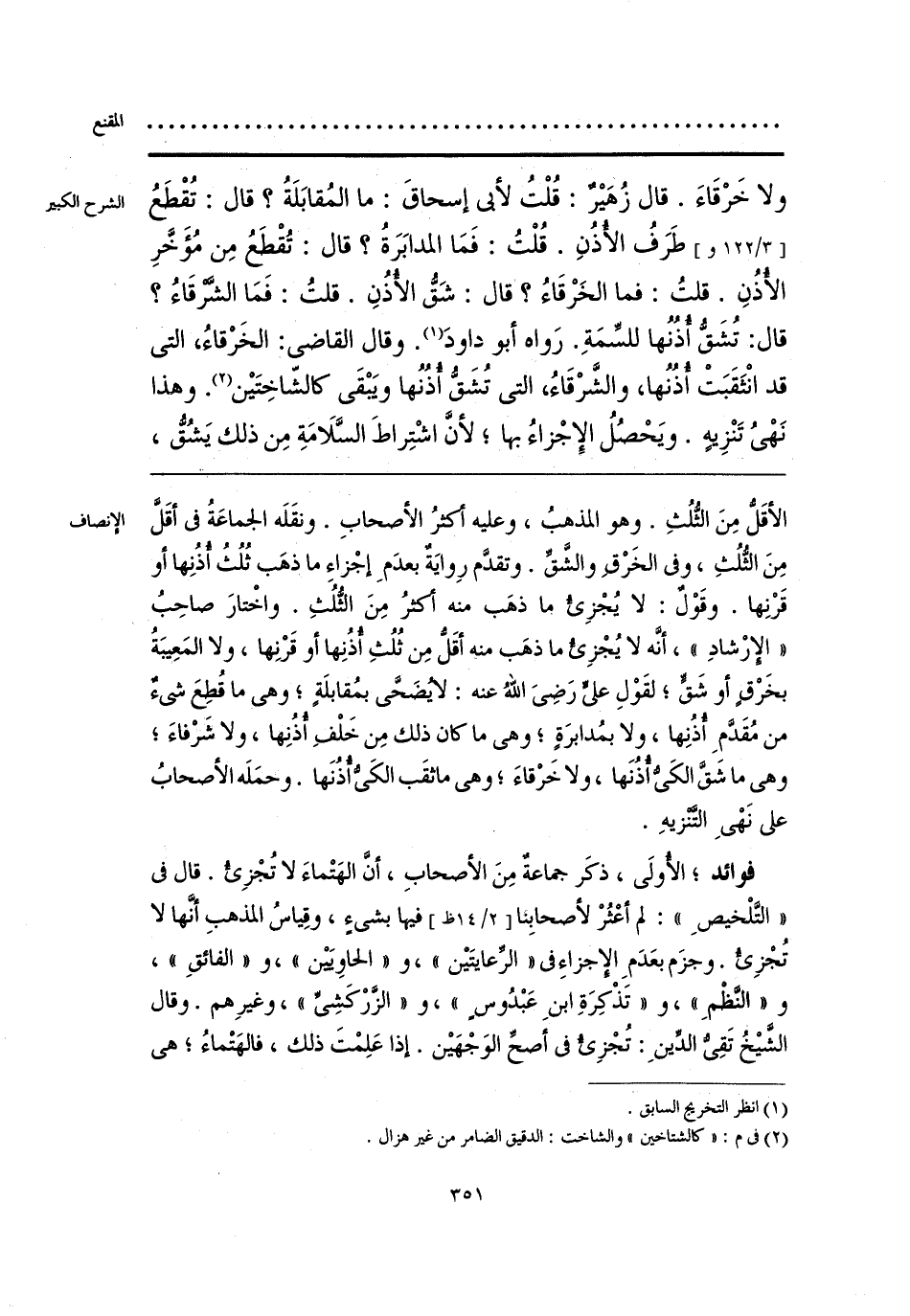 الأقَلُّ مِنَ الثُّلُثِ. وهو المذهبُ، وعليه أكثرُ الأصحابِ. ونقَلَه الجماعَةُ فى أقَلَّ مِنَ الثُّلُثِ، وفى الخَرْقُ والشَّقِّ. وتقدَّم رِوايَةٌ بعدَمِ إجْزاءِ ما ذهَب ثُلُثُ أُذُنِها أو قَرْنِها. وقَوْلٌ: لا يُجْزِئُ ما ذهَب منه أكثرُ مِنَ الثُّلُثِ. واخْتارَ صاحِبُ «الإِرْشادِ»، أنَّه لا يُجْزِئُ ما ذهَب منه أقَلُّ مِن ثُلُثِ أُذُنِها أو قَرْنِها، ولا المَعِيبَةُ بخَرْقٍ أو شَقٍّ؛ لقَوْلِ علىٍّ رَضِىَ اللَّهُ عنه: لا يُضَحَّى بمُقابلَةٍ؛ وهى ما قُطِعَ شئٌ من مُقَدَّمِ أُذُنِها، ولا بمُدابرَةٍ؛ وهى ما كان ذلك مِن خَلْفِ أُذُنِها، ولا شَرْفاءَ؛ وهى ما شَقَّ الكَىُّ أُذُنَها، ولا خرْقاءَ؛ وهى ما ثقَب الكَىُّ أُذُنَها. وحمَلَه الأصحابُ على نَهْىَ التَّنْزيهِ.