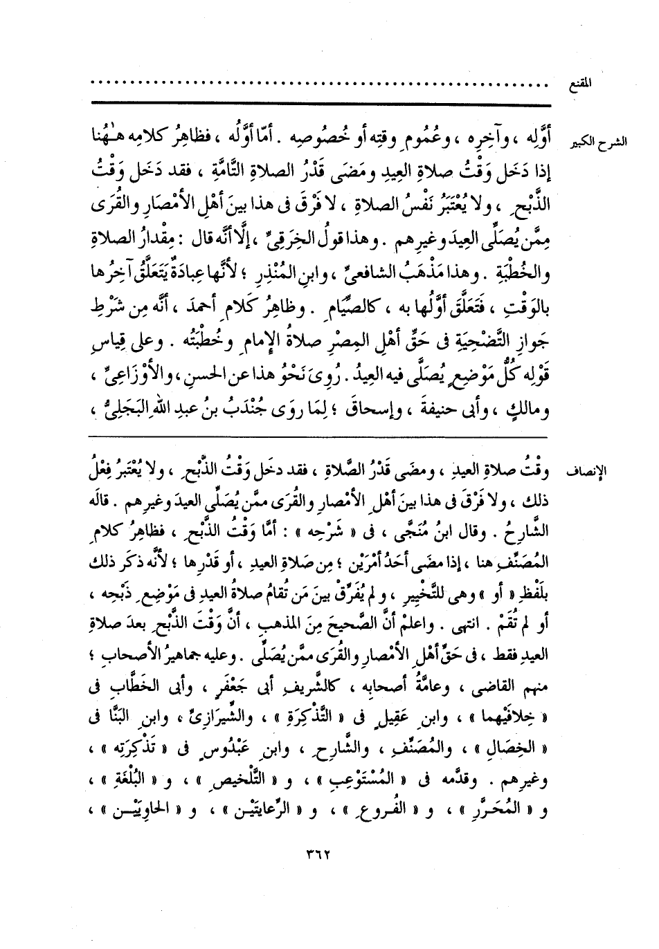 وقْتُ صلاةِ العيدِ، ومضَى قَدْرُ الصَّلاةِ، فقد دخَل وَقْتُ الذَّبْحِ، ولا يُعْتَبرُ فِعْلُ ذلك، ولا فَرْقَ فى هذا بينَ أهْلِ الأمْصارِ والقُرَى ممَّن يُصَلِّى العيدَ وغيرِهم. قالَه الشَّارِحُ. وقال ابنُ مُنَجَّى، فى «شَرْحِه»: أمَّا وَقْتُ الذَّبْحِ، فظاهِرُ كلامِ المُصَنِّفِ هنا، إذا مضَى أحَدُ أمْرَيْن؛ مِن صَلاةِ العيدِ، أو قَدْرِها؛ لأنَّه ذكَر ذلك بلَفْظِ «أو» وهى للتَّخْيِيرِ، ولم يُفَرِّقْ بينَ مَن تُقامُ صلاةُ العيدِ فى مَوْضِعِ ذَبْحِه، أو لم تُقَمْ. انتهى. واعلمْ أنَّ الصَّحيحَ مِنَ المذهب، أنَّ وَقْتَ الذَّبْحِ بعدَ صلاةِ العيدِ فقط، فى حَقِّ أهْلِ الأمْصارِ والقُرَى ممَّن يُصَلِّى. وعليه جماهيرُ الأصحابِ؛ منهم القاضى، وعامَّةُ أصحابِه، كالشَّريفِ أبى جَعْفَرٍ، وأبى الخَطَّاب فى «خِلافَيْهما»، وابنِ عَقِيلٍ فى «التَّذْكِرَةِ»، والشِّيرَازِىِّ، وابنِ البَنَّا فى «الخِصَالِ»، والمُصَنِّفِ، والشَّارِحِ، وابنِ عَبْدُوسٍ فى «تَذكِرَتِه»، وغيرِهم. وقدَّمه فى «المُسْتَوْعِبِ»، و «التَّلْخيصِ»، و «البُلْغَةِ»، و «المُحَرَّرِ»، و «الفُروعِ»، و «الرِّعايتَيْن»، و «الحاوِيَيْن»،
