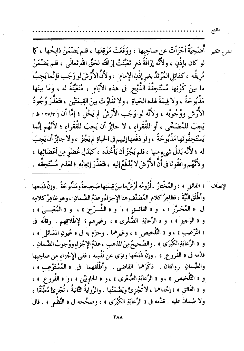 «الفائقِ»: والمُخْتارُ، لُزُومُه أرْشُ ما بينَ قِيمَتِها صَحِيحةً ومَذْبُوحَةً. وإنْ ذَبَحها وأطْلَقَ النِّيَّةَ، فظاهِرُ كلامِ المُصَنِّفِ هنا الإِجزاءُ وعدَمُ الضَّمانِ، وهو ظاهِرُ كلامِه فى «المُحَرَّر»، و «الفائقِ»، و «الشَّرْحِ»، و «المُغْنِى»، و «الوَجيزِ»، و «الرِّعايَةِ الصُّغْرى»، وغيرِهم؛ لإطْلاقِهم. وقالَه فى «التَّرْغيبِ»، و «التَّلْخيصِ»، وغيرِهما. وجزَم به فى «عُيونِ المسَائلِ»، و «الرِّعايَةِ الكُبْرَى». والصَّحيحُ مِن المذهبِ، عدَمُ الإِجْزاءِ ووُجوبُ الضَّمانِ. قدَّمه فى «الفُروعِ». وإنْ ذَبَحَها ونوَى عن نَفْسِه، ففى الإِجْزاءِ عن صاحِبِها والضَّمانِ رِوايَتان. ذكَرَهما القاضى. وأطْلَقهما فى «المُسْتَوْعِبِ»، و «التَّلْخيصِ»، و «الرِّعايَةِ الصُّغْرى»، و «الحاوِيَيْن»، و «الفُروعِ»، و «الفَائقِ»؛ إحْداهما، لا تُجْزِئُ ويَضْمَنُها. والرِّوايةُ الثَّانيةُ، تُجْزِئُ مُطلَقًا، ولا ضَمانَ عليه. قدَّمه فى «الرِّعايَةِ الكُبْرَى»، وصحَّحه فى «النَّظْمِ». قال