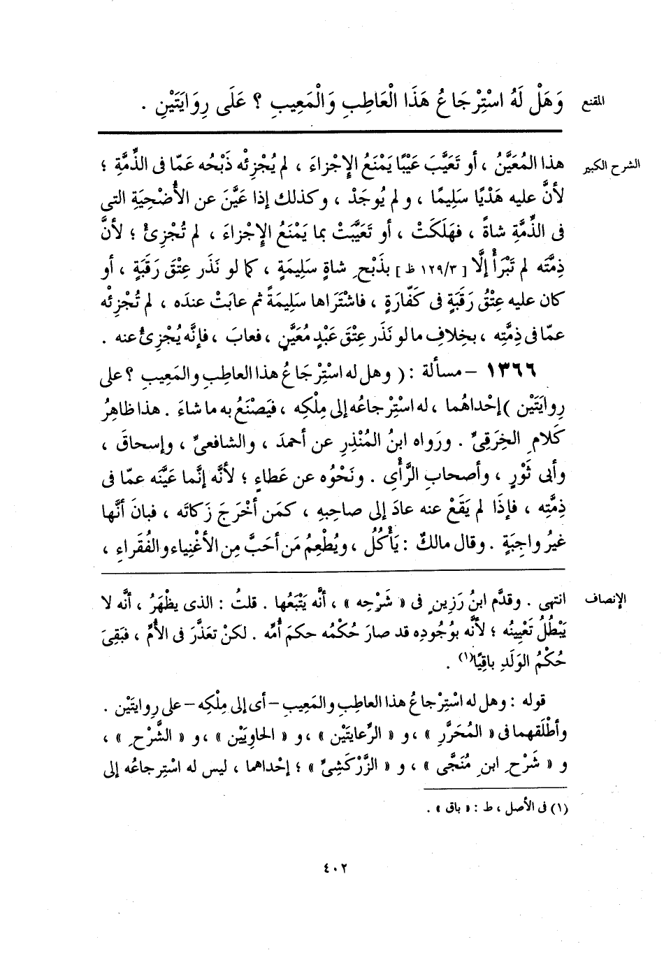 قوله: وهل له اسْتِرْجاعُ هذا العاطِبِ والمَعِيبِ -أى إلى مِلْكِه- على رِوايتَيْن. وأطْلَقهما فى «المُحَرَّرِ»، و «الرِّعايَتَيْن»، و «الحاوِيَيْن»، و «الشَّرْحِ»، و «شَرْحِ ابنِ مُنَجَّى»، و «الزَّرْكَشِىِّ»؛ إحْداهما، ليس له اسْتِرجاعُه إلى