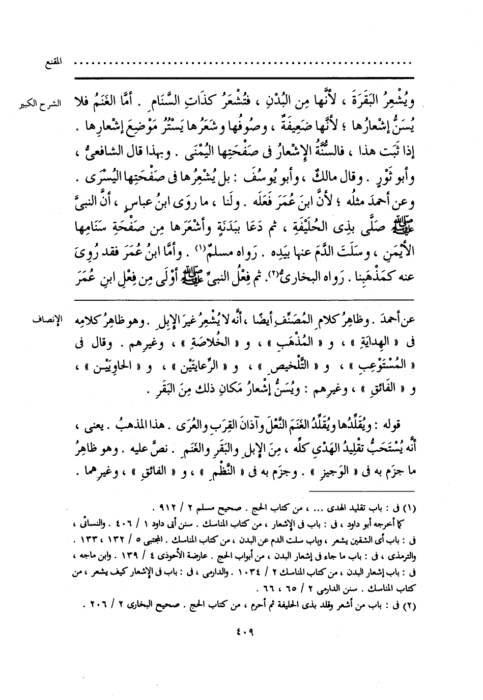 عن أحمدَ. وظاهِرُ كلامِ المُصَنِّفِ أيضًا، أنَّه لا يُشْعِرُ غيرَ الإِبِلِ. وهو ظاهِرُ كلامِه فى «الهِدايَةِ»، و «المُذْهَبِ»، و «الخُلاصَةِ»، وغيرِهم. وقال فى «المُسْتَوْعِبِ»، و «التَّلْخيصِ»، و «الرِّعايتَيْن»، و «الحاويَيْن»، و «الفَائقِ»، وغيرِهم: ويُسَنُّ إشْعارُ مَكانِ ذلك مِنَ البَقَرِ.