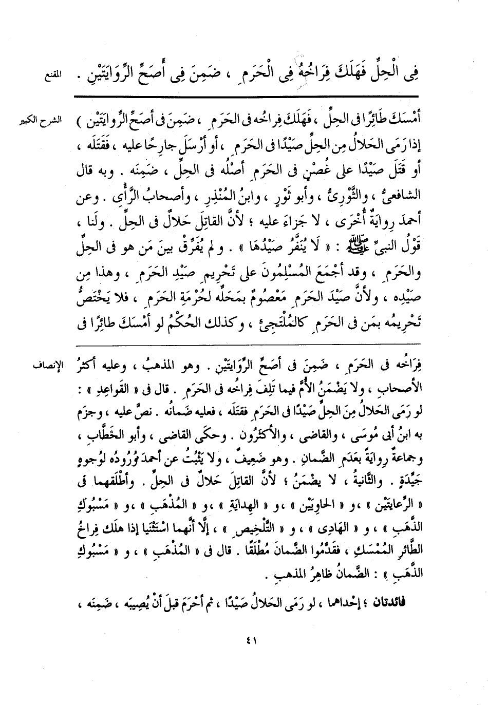 فِرَاخُه فى الحَرَمِ، ضَمِنَ فى أصَحِّ الرِّوَايتَيْن. وهو المذهبُ، وعليه أكثرُ الأصحابِ؛ ولا يَضْمَنُ الأُمَّ فيما تَلِفَ فِراخُه فى الحَرَمِ. قال فى «القَواعِدِ»: لو رَمَى الحَلالُ مِنَ الحِلِّ صَيْدًا فى الحَرَمِ فقتَلَه، فعليه ضَمانُه. نصَّ عليه، وجزَم به ابنُ أبى مُوسَى، والقاضى، والأكثَرُون. وحكَى القاضى، وأبو الخَطَّابِ، وجماعةٌ رِوايَةً بعَدَمِ الضَّمانِ. وهو ضَعِيفٌ، ولا يَثْبُتُ عن أحمدَ وُرُودُه لوُجوهٍ جَيِّدَةٍ. والثَّانيةُ، لا يضْمَنُ؛ لأنَّ القاتِلَ حَلالٌ فى الحِلِّ. وأطْلَقهما فى «الرِّعايتَيْن»، و «الحاوِيَيْن»، و «الهِدايَةِ»، و «المُذْهَبِ»، و «مَسْبُوكِ الذَّهَبِ»، و «الهَادِى»، و «التَّلْخِيصِ»، إلَّا أنهما اسْتَثْنَيا إذا هلَك فِراخُ الطَّائرِ المُمْسَكِ، فقَدَّمُوا الضَّمانَ مُطْلَقًا. قال فى «المُذْهَبِ»، و «مَسْبُوكِ الذَّهبِ»: الضَّمانُ ظاهِرُ المذهبِ.