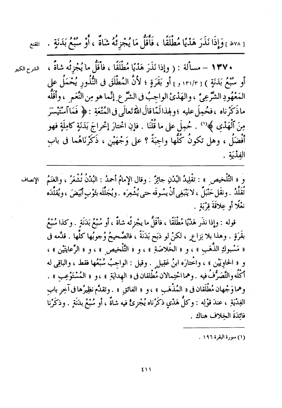 قوله: وإِذا نذَر هَدْيًا مُطْلَقًا، فأقَلُّ ما يجْزِئُهْ شاةٌ، أو سُبْعُ بَدَنَةٍ. وكذا سُبْعُ بقَرَةٍ. وهذا بلا نِزاعٍ، لكنْ لو ذبَح بَدَنَةً، فالصَّحيحُ وُجوبُها كلِّها. قدَّمه فى «مَسْبوكِ الذَّهَبِ»، و «الخُلاصَةِ»، و «التَّلْخيصِ»، و «الرِّعايتَيْن»، و «الحاوِيَيْن»، واخْتارَه ابنُ عَقِيلٍ. وقيل: الواجِبُ سُبْعُها فقط، والباقِى له أكْلُه والتَّصَرُّفُ فيه. وهما احْتِمالان مُطْلقان فى «الهِدايَةِ»، و «المُسْتَوْعِبِ». وهما وَجْهان مُطْلَقان فى «المُذْهَبِ»، و «الفائقِ». وتقدَّم نظِيرُها فى آخِرِ بابِ الفِدْيَةِ، عندَ قوْلِه: وكلُّ هَدْىٍ ذكَرْناه يُجْزِئُ فيه شاةٌ، أو سُبْعُ بدَنَةٍ. وذكَرْنا فائِدَةَ الخِلاف هناك.