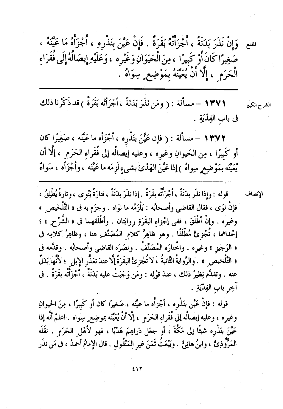 قوله: وإذا نذَر بدَنَةً، أَجْزَأَتْه بقَرَةٌ. إذا نذَرَ بدَنَةً، فتارَةً يَنْوِى، وتارةً يُطْلِقُ، فإنْ نوَى، فقال القاضى وأصحابُه: يَلْزَمُه ما نوَاه. وجزَم به فى «التَّلْخيصِ» وغيرِه. وإنْ أطْلَقَ، ففى إجْزاءِ البقَرَةِ رِوايَتان. وأطْلَقهما فى «الشَّرْحِ»؛ إحْداهما، تُجْزِئُ مُطْلَقًا. وهو ظاهِرُ كلامِ المُصَنِّفِ هنا، وظاهِرُ كلامِه فى «الوَجيزِ» وغيرِه. واخْتارَه المُصَنِّفُ. ونصَرَه القاضى وأصحابُه. وقدَّمه فى «التَّلْخيصِ». والرِّوايةُ الثَّانيةُ، لا تُجْزِئُ البقَرَةُ إلَّا عندَ تعَذُّرِ الإبلِ؛ لأنَّها بَدَلٌ عنه. وتقدَّم نِظيرُ ذلك، عندَ قوْلِه: ومَن وَجَبَتْ عليه بَدَنَة، أجْزَأتْهُ بقَرَةٌ. فى آخِرِ بابِ الفِدْيَةِ.