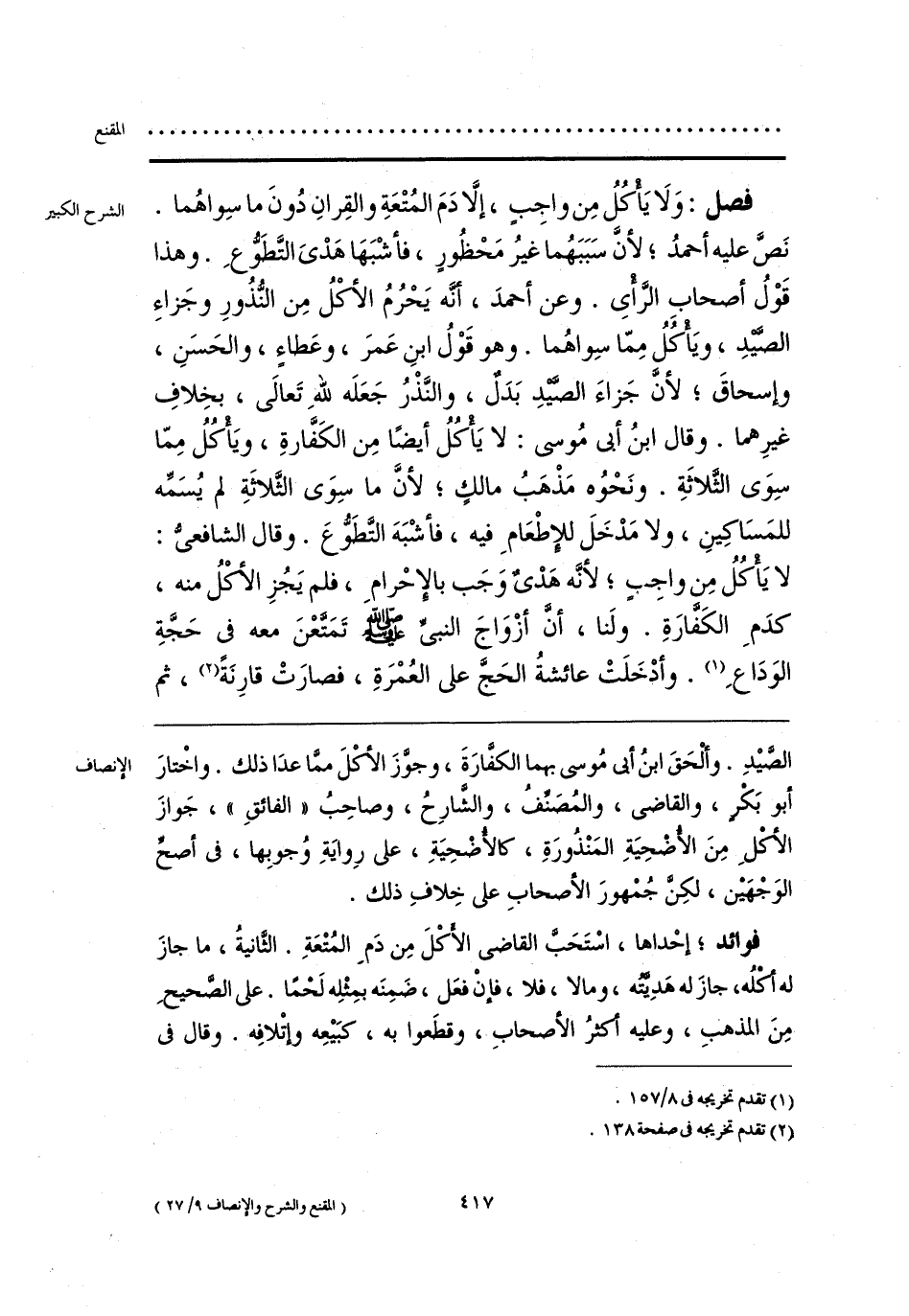 الصَّيْدِ. وألْحَقَ ابن أبى مُوسى بهما الكفَّارَةَ، وجوزَ الأَكْلَ ممَّا عدَا ذلك. واخْتارَ أبو بَكْرٍ، والقاضى، والمُصَنِّفُ، والشَّارِحُ، وصاحِبُ «الفائقِ»، جَوازَ الأكْلِ مِنَ الأُضْحِيَةِ المَنْذُورَةِ، كالأُضْحِيَةِ، على رِوايَةِ وُجوبِها، فى أصحِّ الوَجْهَيْن، لكِنَّ جُمْهورَ الأصحابِ على خِلافِ ذلك.
