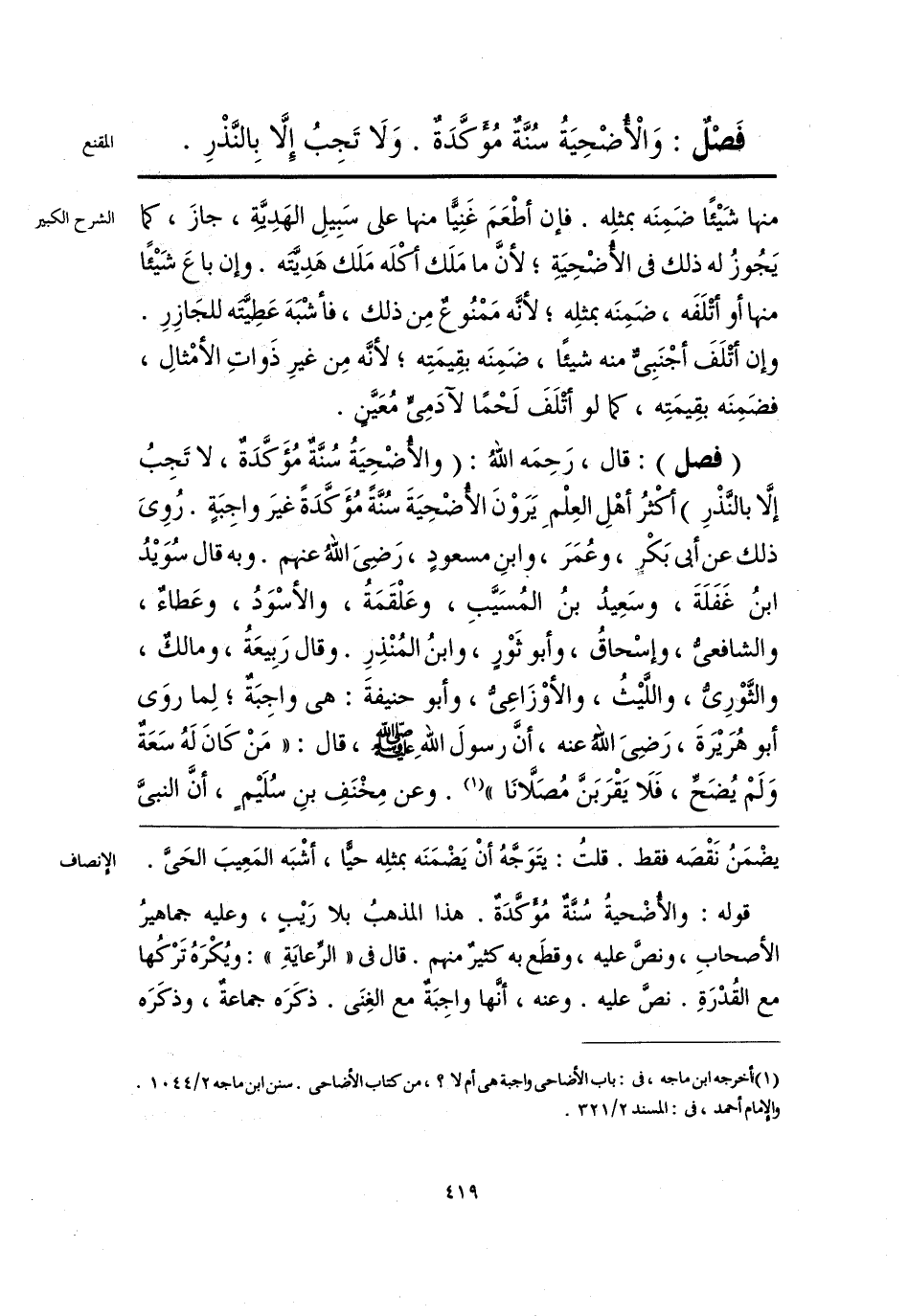 قوله: والأُضْحيةُ سُنَّةٌ مُؤكَّدَةٌ. هذا المذهبُ بلا رَيْبٍ، وعليه جماهيرُ الأصحابِ، ونصَّ عليه، وقطَع به كثيرٌ منهم. قال فى «الرِّعايَةِ»: ويُكْرَهُ تَرْكُها مع القُدْرَةِ. نصَّ عليه. وعنه، أنَّها واجِبَة مع الغِنَى. ذكَرَه جماعةٌ، وذكَرَه