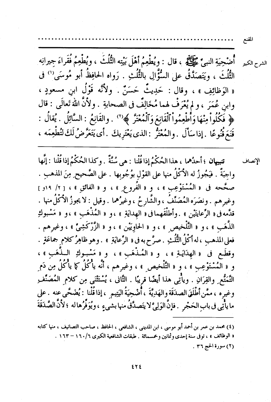 تنبيهان؛ أحدُهما، هذا الحُكْمُ إذا قُلْنا: هى سُنَّةٌ. وكذا الحُكْمُ إذا قُلْنا: إنَّها واجِبَةٌ. فيَجُوزُ له الأكْلُ منها على القوْلِ بوُجُوبِها. على الصَّحيحِ مِنَ المذهبِ. صحَّحه فى «المُسْتَوْعِبِ»، و «الفُروعِ»، و «الفائقِ»، وغيرِهم. ونصَرَه المُصَنِّفُ، والشَّارِحُ، وغيرُهما. وقيل: لا يجوزُ الأكْلُ منها. قدَّمه فى «الرِّعايتَيْن». وأطلْقَهما فى «الهِدايَةِ»، و «المُذْهَبِ»، و «مَسْبوكِ الذَّهَبِ»، و «التَّلْخيصِ»، و «الحاوِيَيْن»، و «الزَّرْكَشِىِّ»، وغيرِهم. فعلى المذهبِ، له أكْلُ الثُّلُثِ. صرَّح به فى «الرِّعايَةِ». وهو ظاهِرُ كلام جماعَةٍ. وقطَع فى «الهِدَايَةِ»، و «المُذْهَبِ»، و «مَسْبوكِ الذَّهَبِ»، و «المُسْتَوْعِبِ»، و «التَّلْخيصِ»، وغيرِهم، أنَّه يأْكُلُ كما يأْكُلُ مِن دَمِ التَّمَتُّعِ والقِرَانِ. ويأْتِى هذا أيضًا قرِيبًا. الثَّانى، يُسْتَثْنَى مِن كلامِ المُصَنِّفِ وغيرِه، ممَّن أطْلَقَ الصَّدَقَة والهَدِيَّةَ، أُضْحِيَةُ اليَتيمِ، إذا قُلْنا: يُضَحَّى عنه. على ما يأْتِى فى بابِ الحَجْرِ. فإنَّ الوَلِىَّ لا يتَصدَّقُ منها بشئٍ، ويُوَفِّرُها له؛ لأنَّ الصَّدَقَةَ